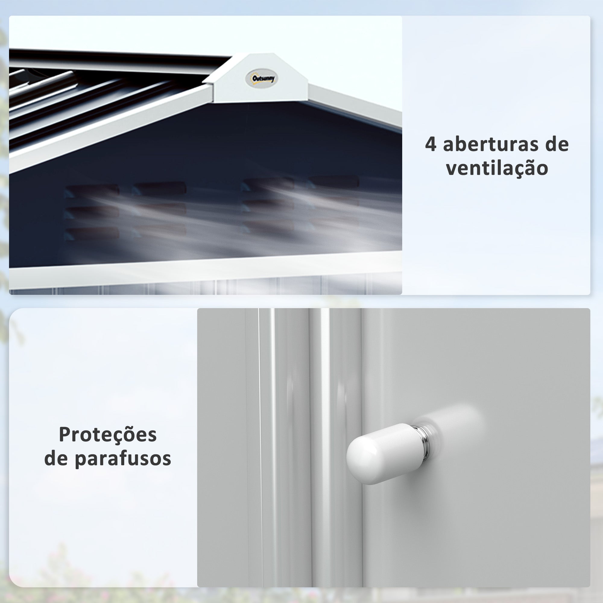 • VENTILAÇÃO E CLARABÓIA: Este abrigo de jardim inclui quatro ranhuras de ventilação (duas à frente e duas atrás) e uma clarabóia em fibra de vidro no telhado, permitindo a entrada de luz natural. As portas deslizantes facilitam o acesso sem ocupar espaço