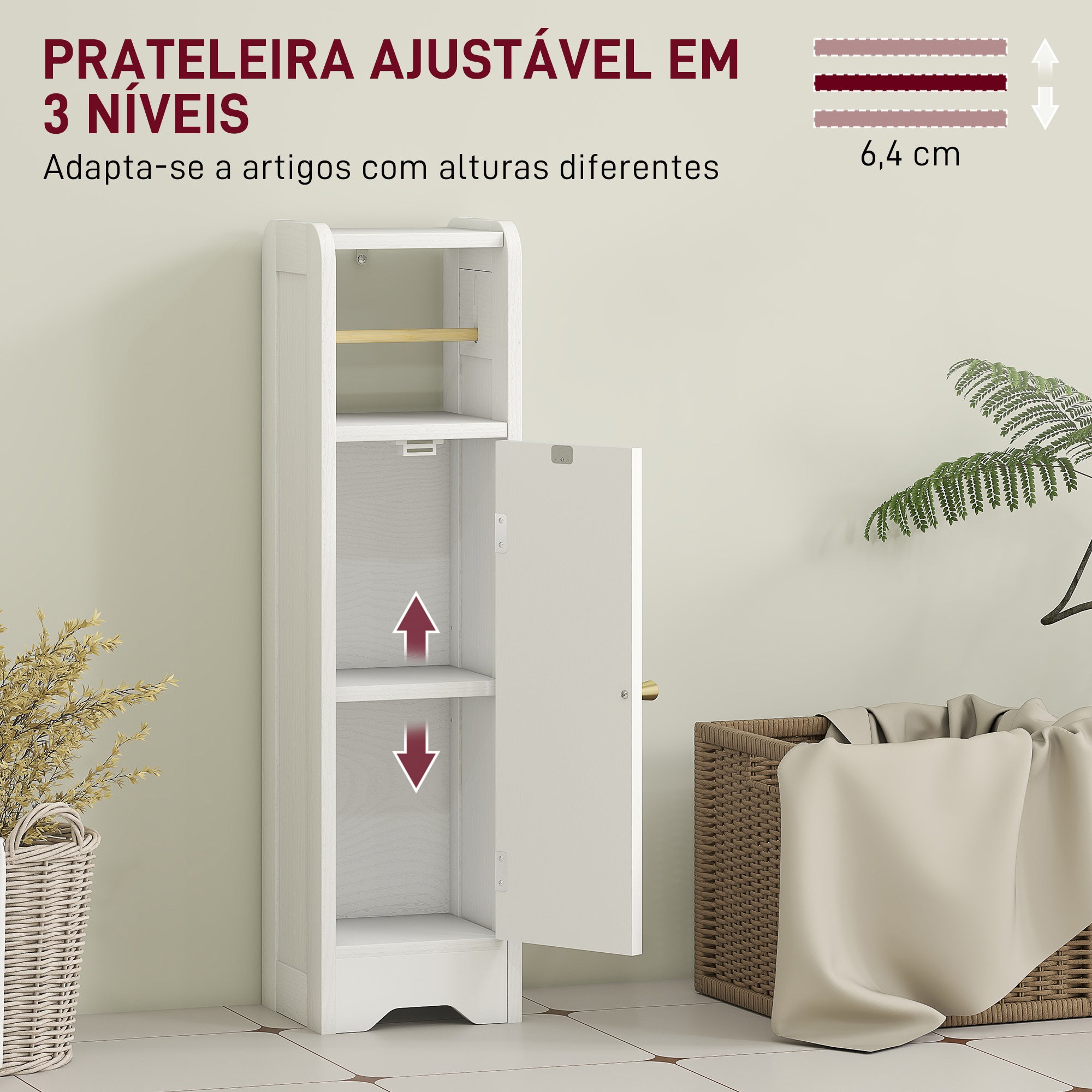 • Este armário estreito para casa de banho aproveita ao máximo espaços reduzidos A porta com painel arqueado e o puxador dourado conferem·lhe um estilo moderno Conta com uma prateleira interior ajustável em três alturas A parte superior é ideal para colocar pequenos objetos como o telemóvel ou uma vela O suporte de rolo é amovível e permite um uso versátil Inclui kit anti·tombo para maior segurança Superfície em melamina resistente a riscos e fácil de limpar Monta·se facilmente com instruções claras e peças assinaladas