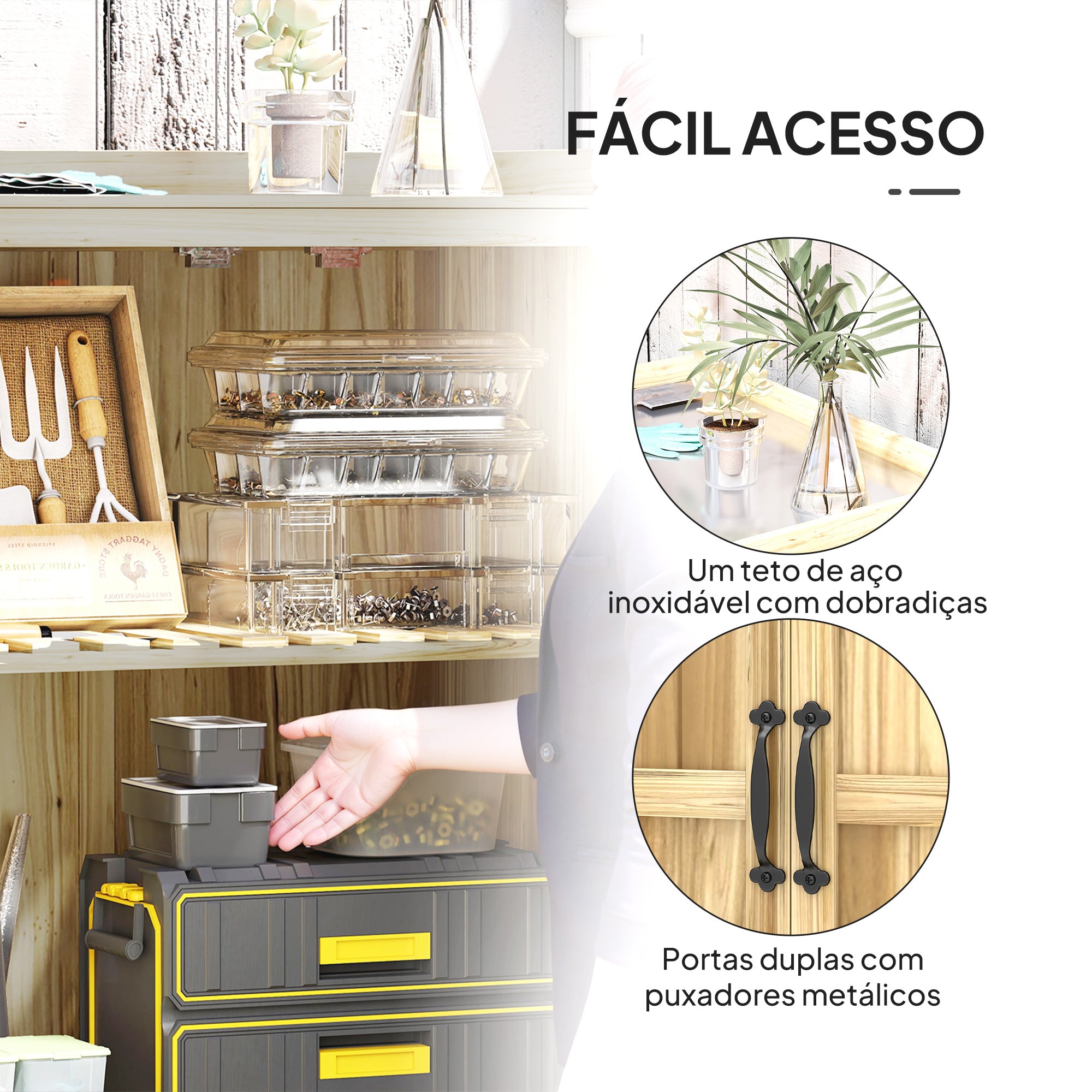 - Este armário de jardim da Outsunny funciona como móvel de armazenamento e banco de trabalho exterior O armário de exterior tem tampa basculante e portas duplas com puxadores metálicos que facilitam o acesso Inclui uma prateleira interna para organizar ferramentas e um desenho em ripas que melhora a ventilação Possui tampo em aço inoxidável resistente à água, abrasão e corrosão A madeira de abeto envernizada oferece proteção contra a humidade e assegura durabilidade O armário de exterior requer montagem e inclui manual de instruções