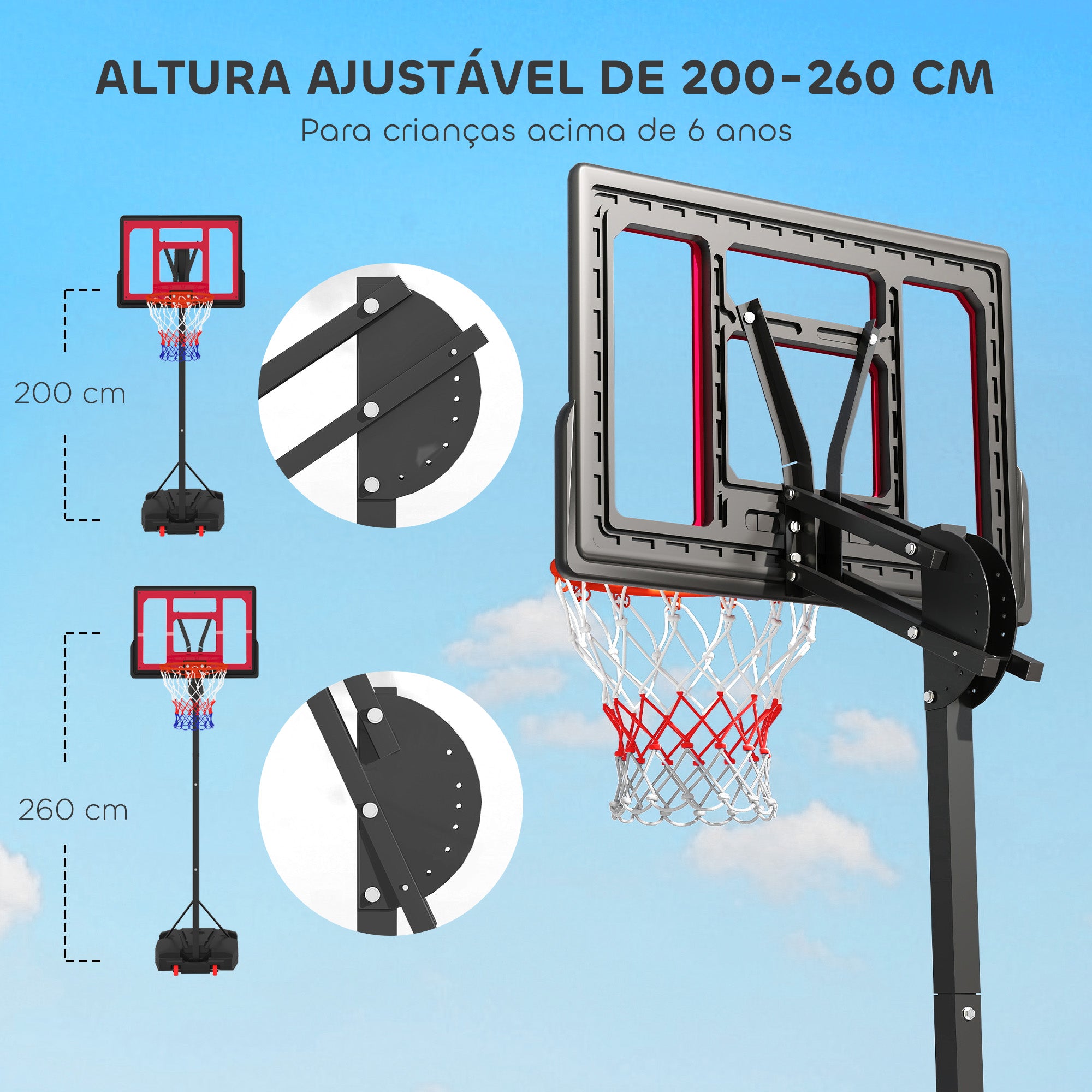 Tabela de Basquetebol para Crianças com Altura Ajustável de 200 a 260 cm Cesta de Basquetebol para Interior e Exterior com Saco de Pesos para Crianças a partir dos 6 Anos Vermelho e Preto