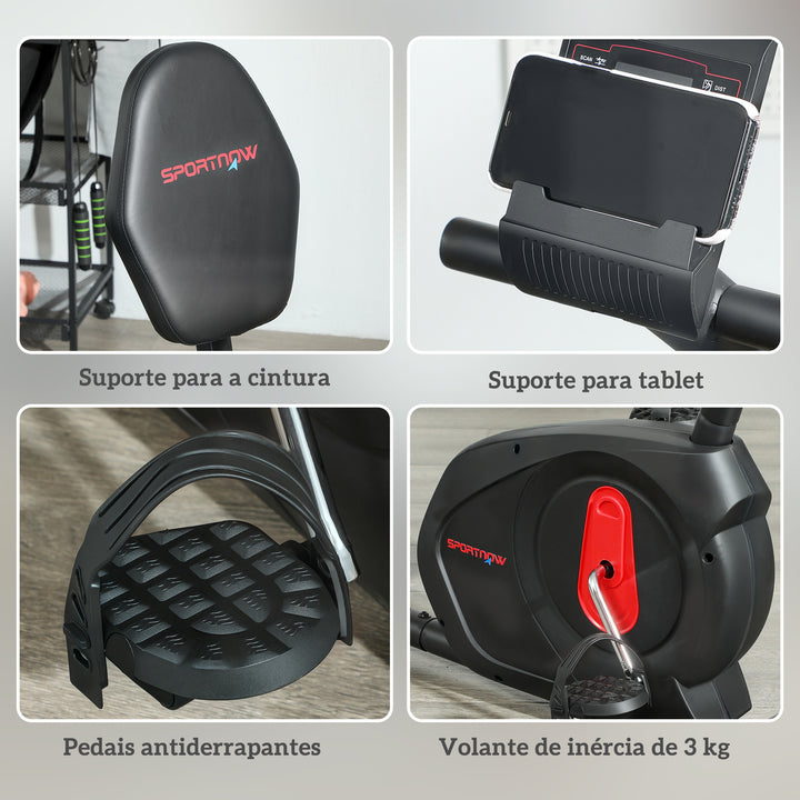 - A bicicleta estática reclinada possui resistência magnética ajustável para se adaptar a diferentes níveis de treino Conta com um assento amplo e ajustável na posição horizontal para maior conforto ao pedalar O ecrã LCD exibe tempo, distância, velocidade, odómetro e calorias queimadas para um acompanhamento preciso Inclui encosto lombar e pedais antiderrapantes com correias ajustáveis para maior segurança Dispõe de um suporte para tablet para desfrutar de entretenimento durante os treinos As rodas de transporte facilitam o deslocamento e armazenamento sem esforço Ideal para treinos de baixo impacto, perfeita para idosos, pessoas em reabilitação ou quem procura um exercício suave e eficaz