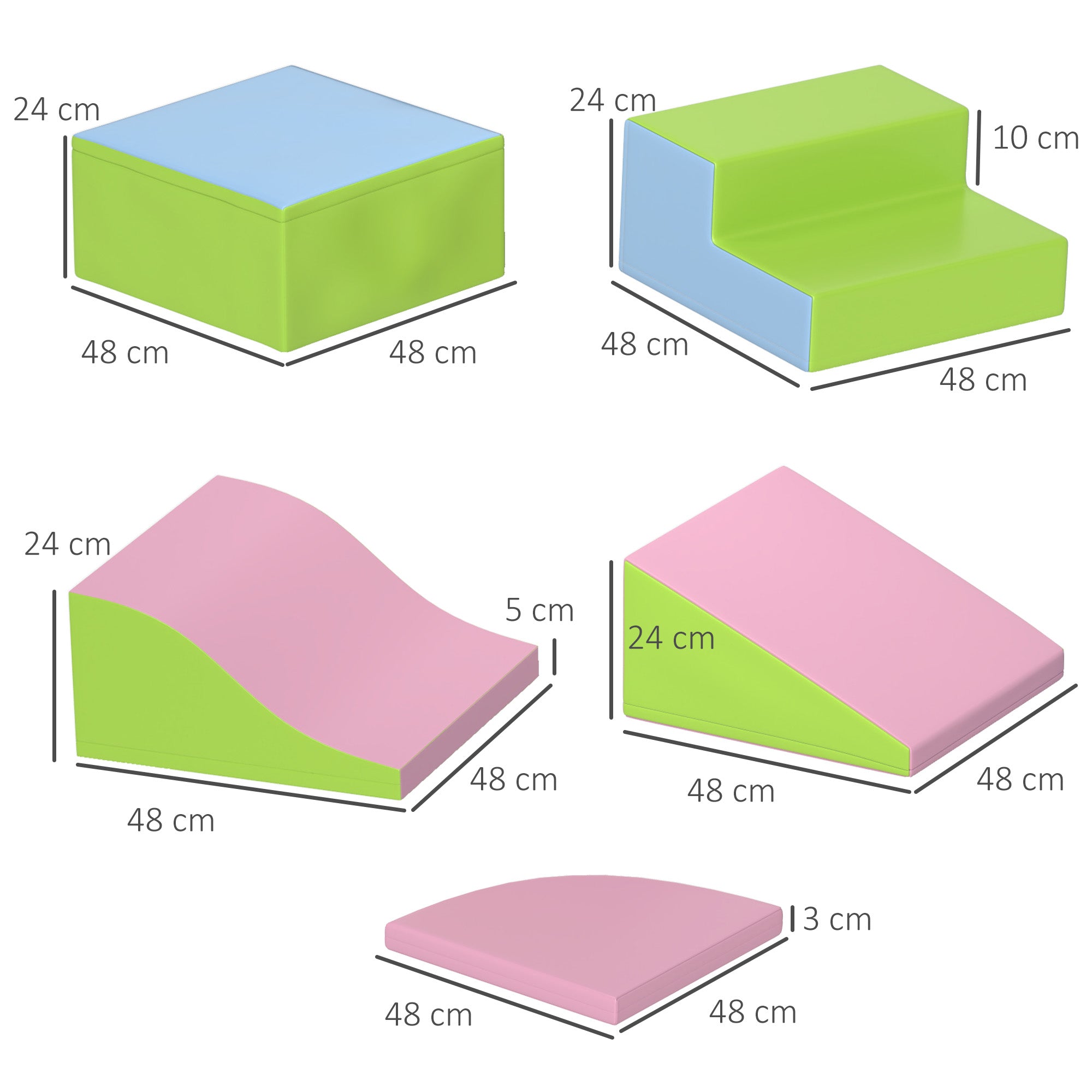• MEDIDAS TOTAIS: Medidas do bloco retangular: 48x48x24cm. Medidas do bloco de escada: 48x48x24cm. Medidas do bloco de rampa: 48x48x24 cm. Medidas do bloco em leque: 48x48x3cm. Medidas do bloco inclinado: 48x48x24cm. Idade certificada: 12 a 36 meses, idade recomendada: 12 a 36 meses. Capacidade máxima de peso: 60kg. Certificação: EN71·1·2·3. Não requer montagem Não há nada melhor para a estimulação precoce e habilidades motoras das crianças do que brinquedos que podem estimular suas habilidades. E este conjunto de 6 peças grandes de espuma como blocos de construção do HOMCOM é ideal. Com uma rampa, escada, entre outros, as crianças poderão se divertir fazendo exercícios, rastejar, engatinhando e muito mais. Além disso, por serem totalmente acolchoados em espuma, são totalmente seguros e seus estofados em couro sintético são muito fáceis de limpar