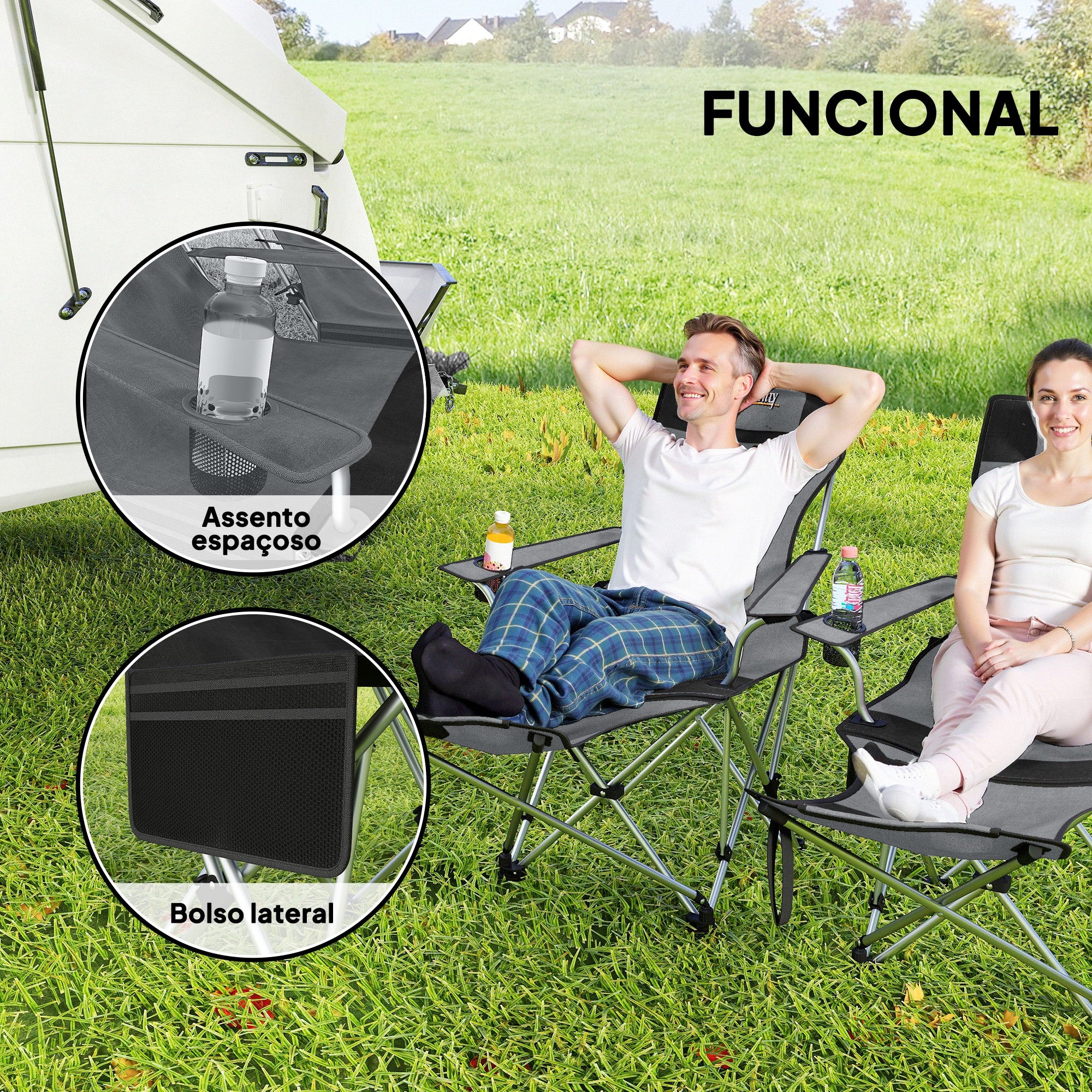 • Estas cadeiras de campismo dobráveis contam com um apoio de pés removível que lhe permite esticar·se e desfrutar de um descanso total Têm um apoio de cabeça acolchoado que proporciona um suporte extra para o seu pescoço, melhorando o seu conforto a cada utilização O seu tecido Oxford 600D é resistente ao desgaste e a respingos, garantindo durabilidade e manutenção simples Contam com um prático porta·copos e um bolso lateral para que tenha sempre os seus objetos essenciais ao alcance Dobradas a um tamanho compacto, cabem facilmente na bolsa de transporte incluída, facilitando o seu armazenamento e transporte