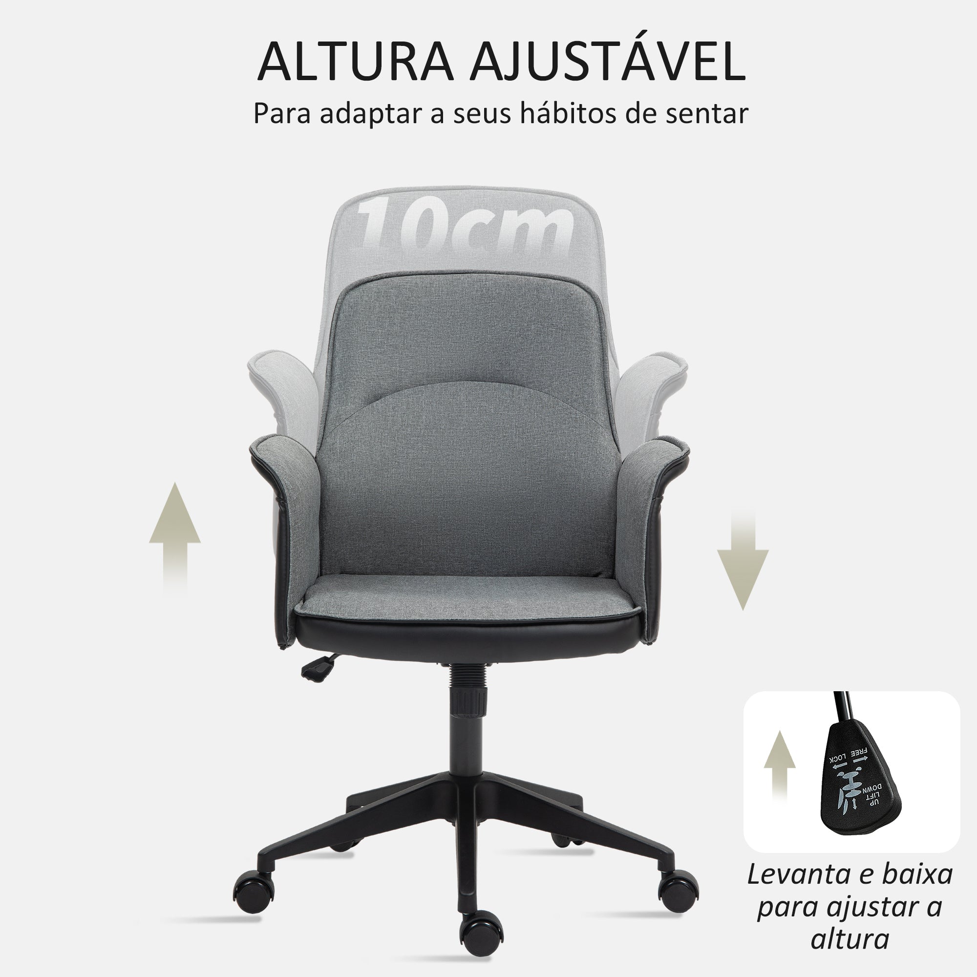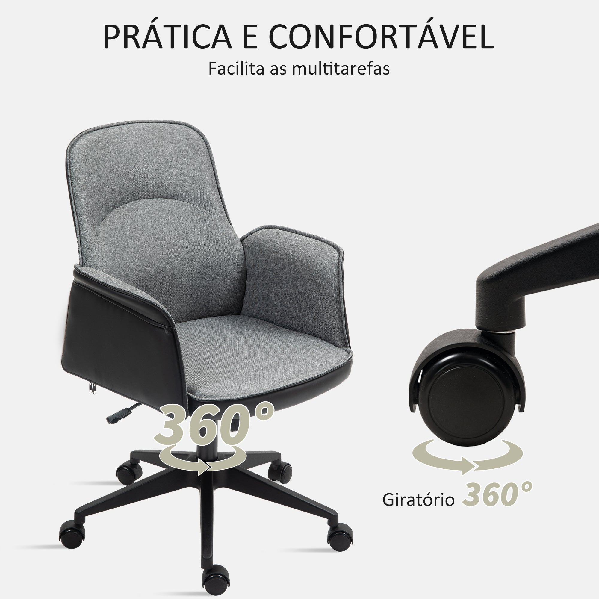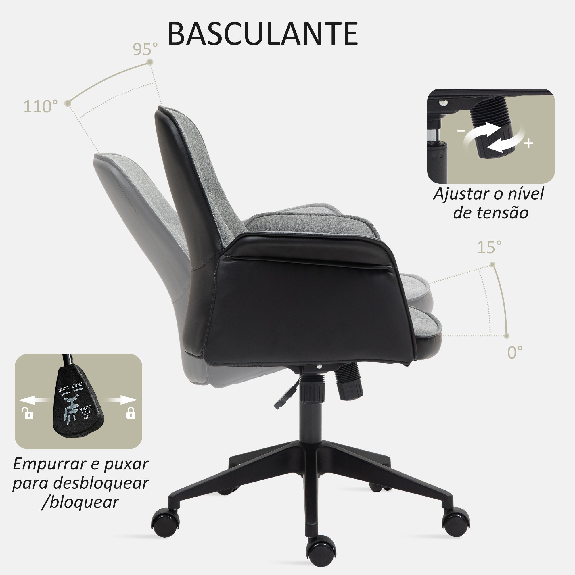 - 1 x Manual de instruções Se trabalha longas horas e precisa de um local confortável, esta cadeira de escritório elegante da HOMCOM oferece o conforto essencial. Com um tecido tipo linho, respirável, combinado com couro PU de fácil manutenção, possui um acolchoado de espuma de densidade média e apoios de braços estilizados para um suporte adicional e maior comodidade. Aproveite também a sua função de basculante suave e ajuste a altura conforme as suas necessidades. Perfeita para otimizar o seu desempenho no trabalho