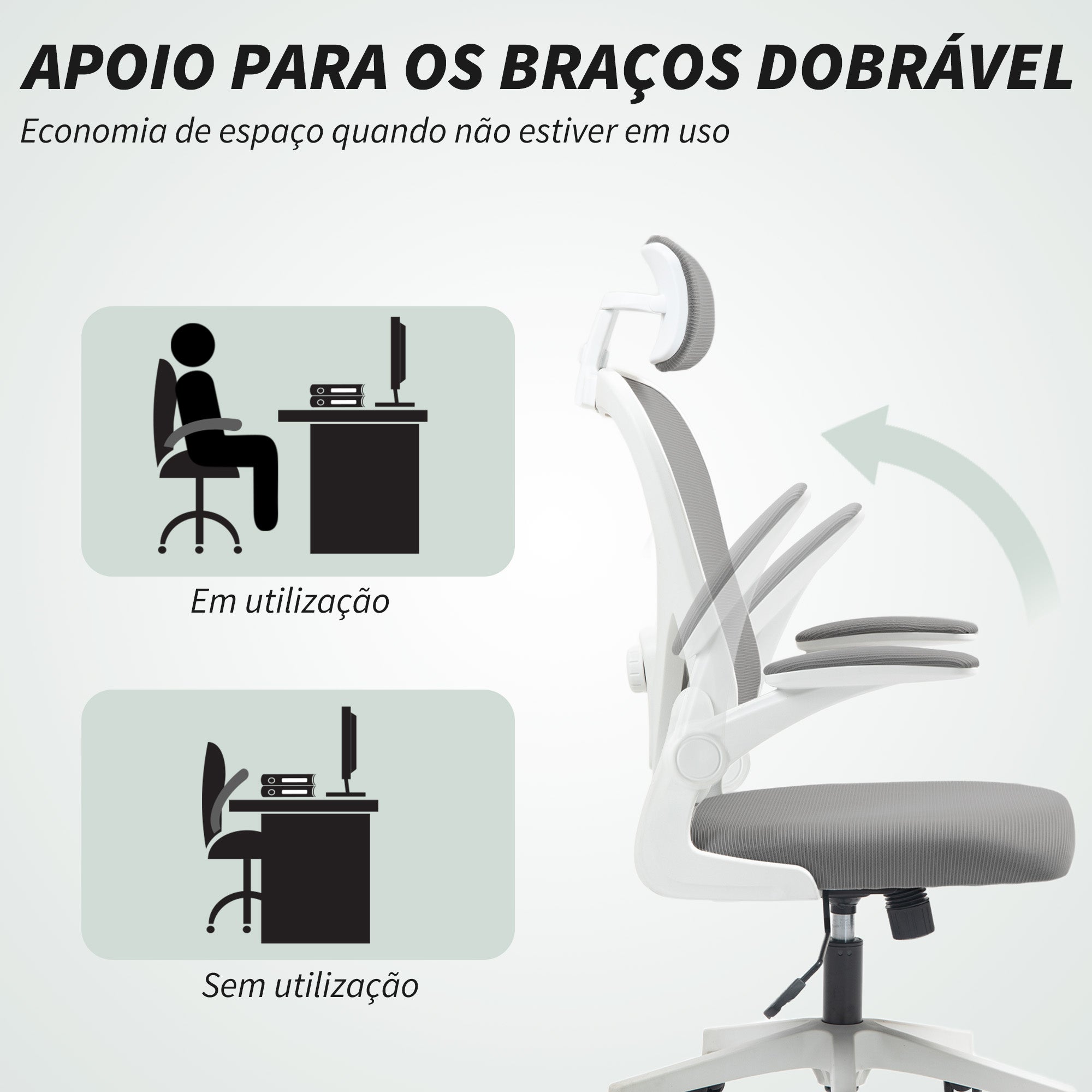 - APOIO DE BRAÇOS DOBRÁVEL: Os apoios de braços dobráveis desta cadeira de estudo permitem·lhe poupar espaço e facilitam a transição entre tarefas, tornando o seu trabalho quotidiano mais prático e confortável