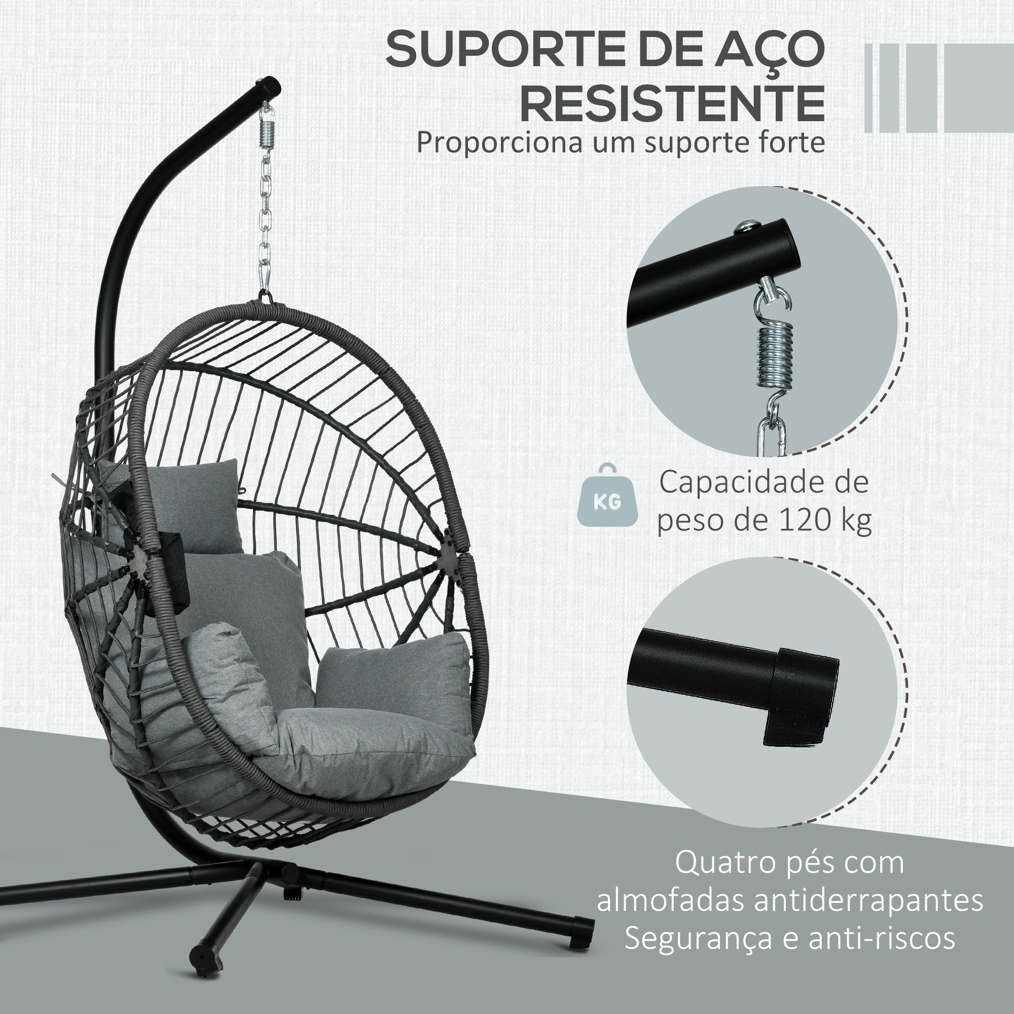 Cadeira Suspensa com Suporte Cadeira Baloiço de Exterior com Cesta Dobrável Almofada e Apoio para a Cabeça Cadeira Suspensa para Interior e Exterior Carga 120 kg Cinza