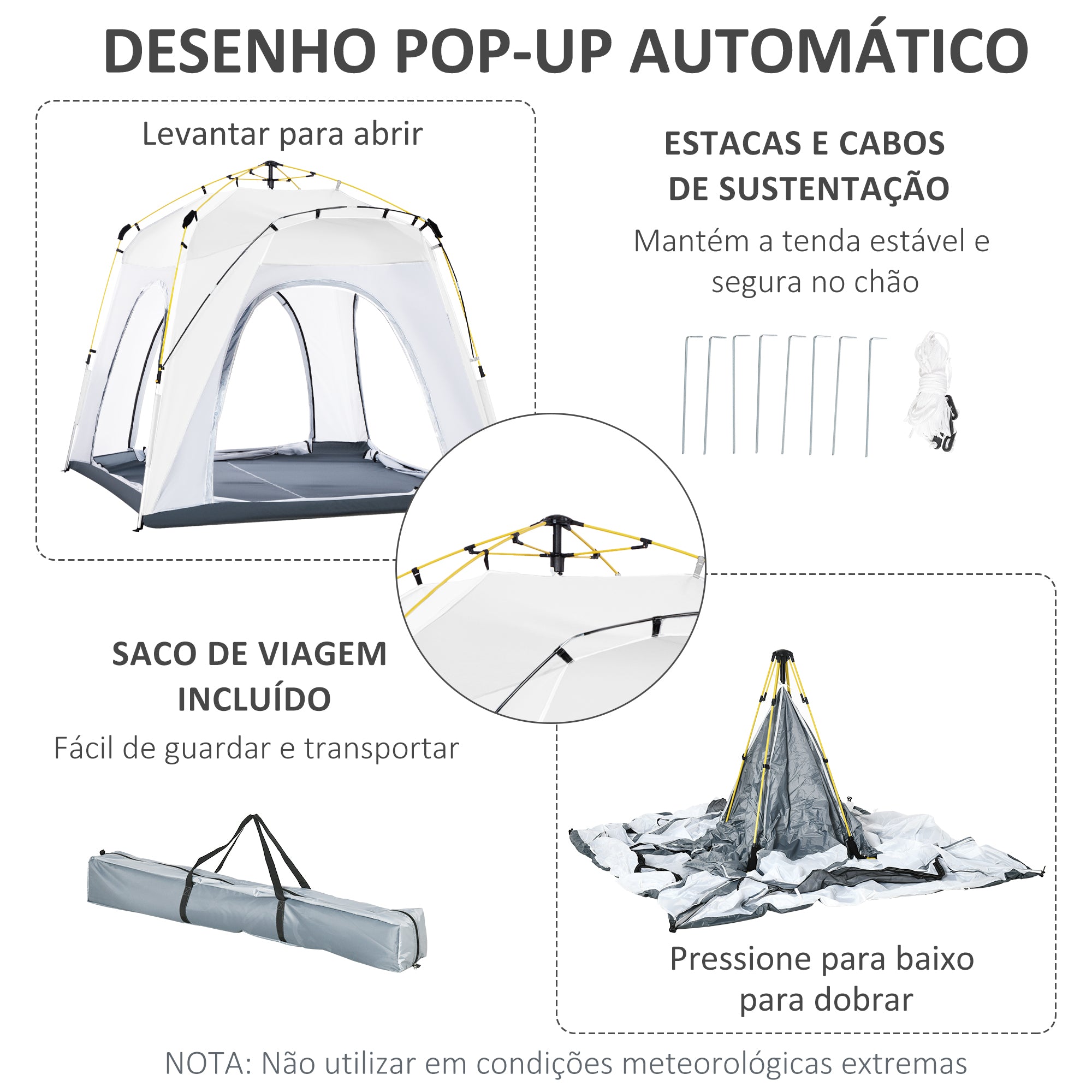 - ACESSÓRIOS INCLUÍDOS: Com 8 estacas de solo de aço galvanizado, 4 cordas de tensão, gancho central para pendurar candeeiro, cobertura externa e bolsa de transporte, esta tenda de campismo dobrável permite que aproveite ao máximo as suas atividades ao ar livre. MEDIDAS TOTAIS: 240x240x199 cm. Requer montagem. NOTA: Esta tenda não é adequada para condições climáticas adversas, não utilize·a em caso de ventos, chuva ou neve Esta tenda de campismo da Outsunny é ideal para passeios de um dia, mochileiros, parques de campismo e muito mais. Com um desenho pop up, esta tenda de campismo poderá em questão de minutos ser facilmente montada! E quando não estiver a ser utilizada, basta apertar o botão na parte superior para desmontá·la. Além disso, conta com uma bolsa para facilitar o transporte, estacas e cordas de tensão para uma maior estabilidade e segurança e um prático bolso no interior para pequenos objetos