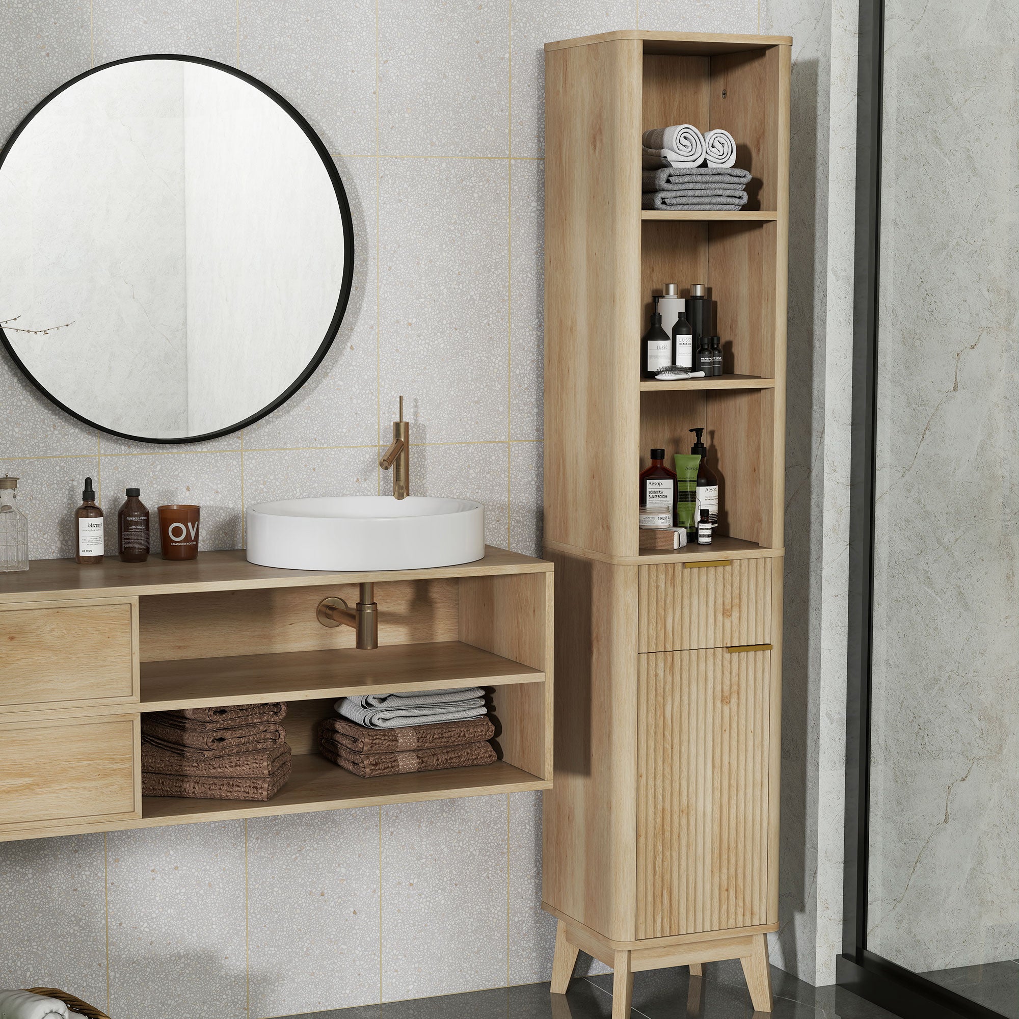 - Coluna de casa de banho com painéis canelados e puxadores dourados para um toque moderno e sofisticado Inclui compartimentos abertos, um armário e uma gaveta para uma arrumação eficiente Conta com 2 prateleiras ajustáveis em três níveis para diferentes necessidades de arrumação O design alto e estreito permite poupar espaço, ideal para áreas pequenas Equipado com sistema anti·tombo e pés antiderrapantes para maior estabilidade e segurança Porta com dobradiça para um acesso fácil aos objetos guardados Requer montagem