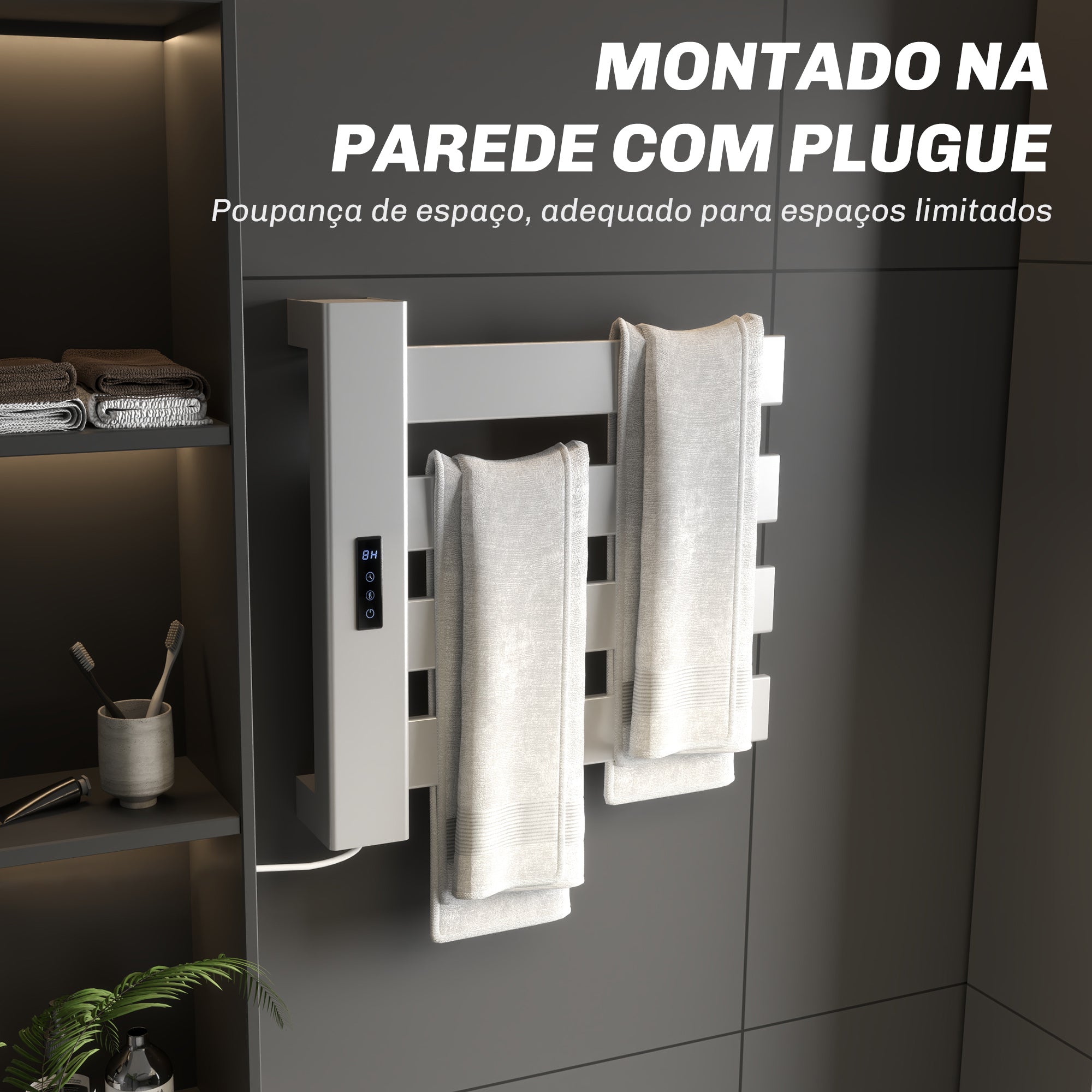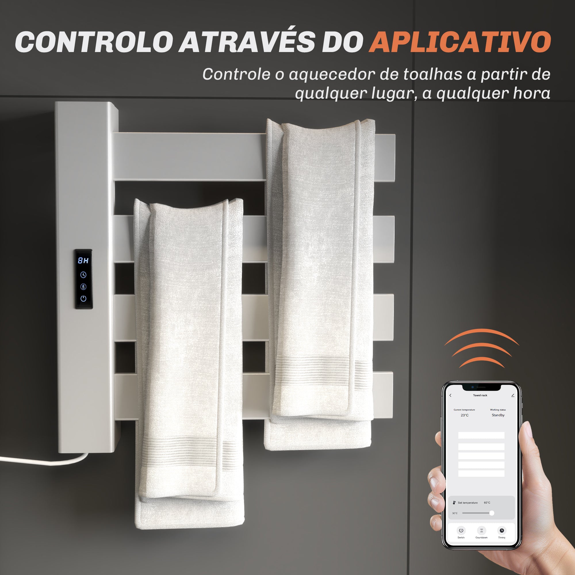 - Este aquecedor de toalhas elétrico é facilmente controlado a partir do ecrã tátil ou da aplicação Tuya Este toalheiro tem 4 barras que oferecem espaço para pendurar e um tubo plano largo que melhora a distribuição do calor A sua construção em liga de alumínio tem uma classificação IPX4 à prova de água Atinge uma temperatura de até 60°C em apenas 15 minutos (a 20°C) e inclui proteção contra sobreaquecimento Permite o ajuste da temperatura entre 30°C e 60°C em incrementos de 5°C Temporizador programável de 1 a 24 horas O visor LCD mostra a temperatura selecionada em qualquer momento Fácil instalação e funcionamento por encaixe