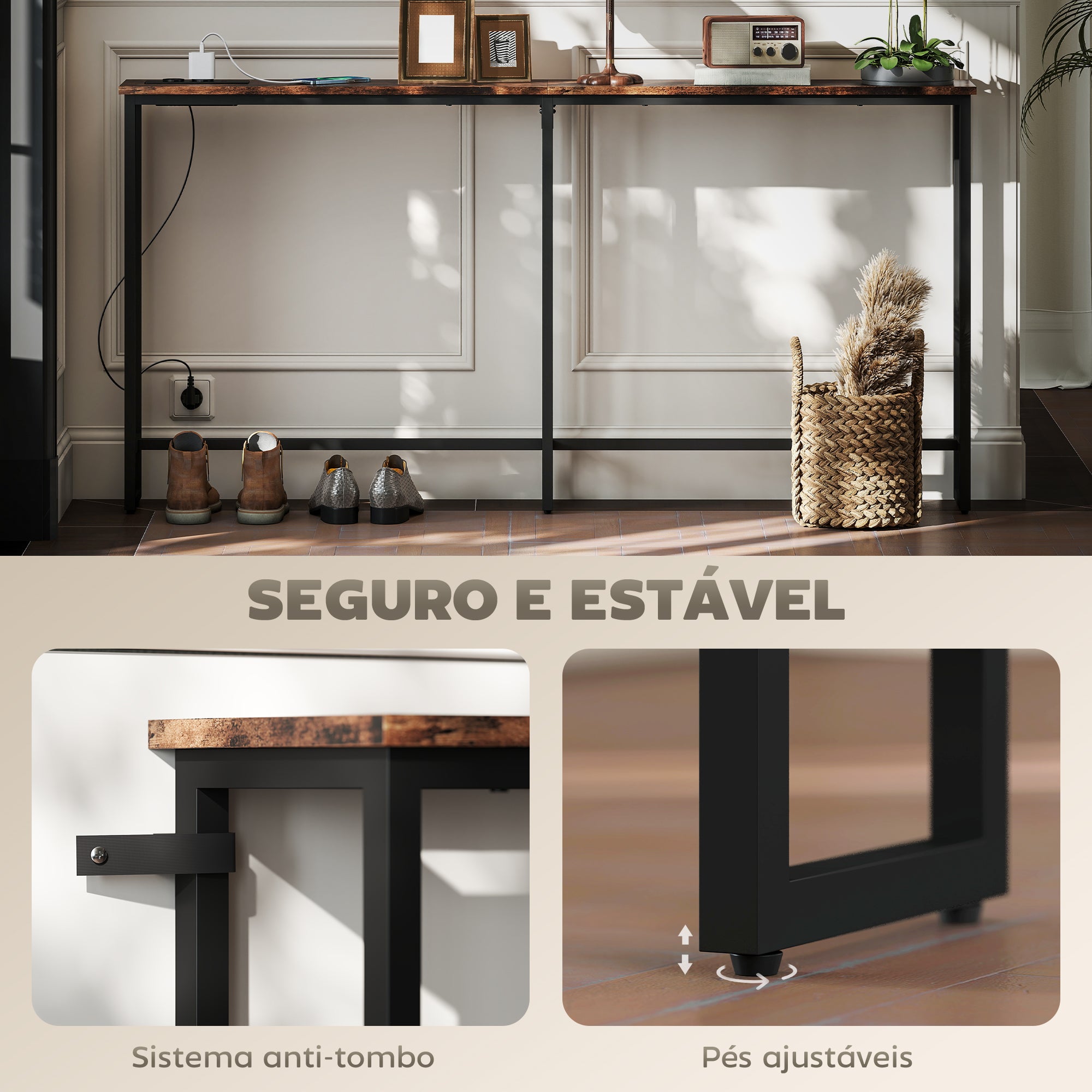 Mesa de Consola Estreita 160 cm Consola com Estação de Carga Estrutura de Aço Estilo Industrial para Corredor Entrada Sala de Estar Dormitório Marrom Rústico