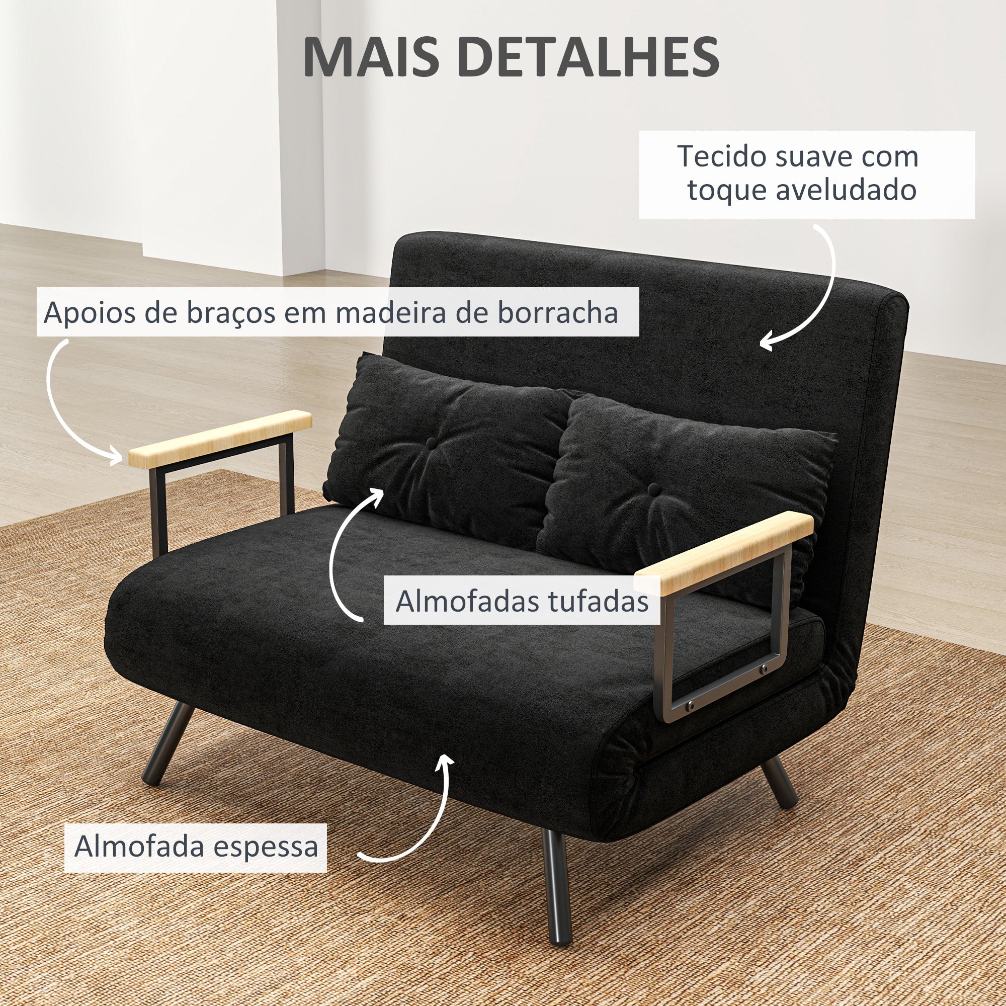 • Pode ser utilizada como sofá, cama de casal ou chaise lounge Encosto ajustável em 5 níveis: 100°, 120°, 140°, 160°, 180° Possui 2 almofadas extra e assento acolchoado para um máximo de conforto Almofadas com um fecho de correr para facilitar a limpeza Fabricado com estrutura em aço para uma maior estabilidade e durabilidade Os apoios para o braço de madeira de borracha são resistente e proporcionam um suporte extra Requer montagem