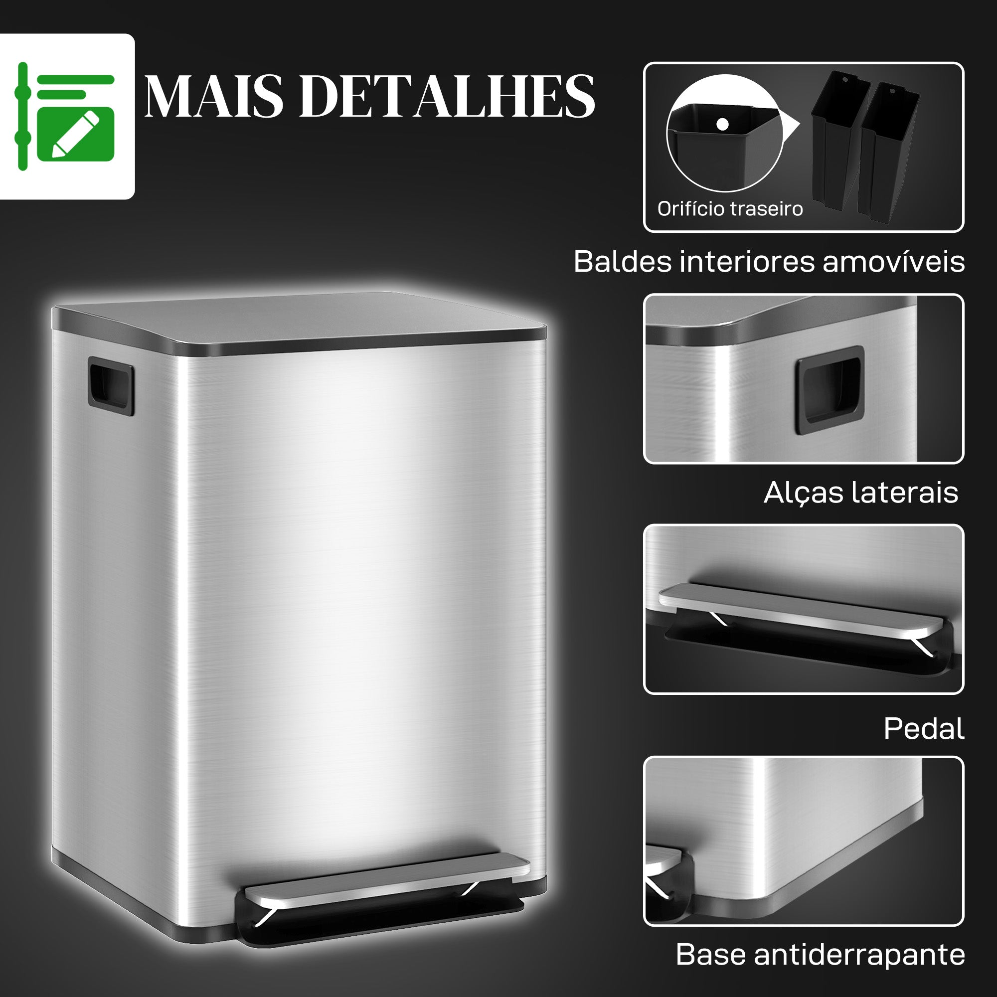 - MEDIDAS TOTAIS: 41,8x36,7x58 cm (CxLxA). Capacidade 2 cubos de 20L. Não requer montagem Mantenha a sua cozinha organizada e livre de odores indesejáveis com este contentor de lixo da HOMCOM! Equipado com dois compartimentos de 20L, é ideal para separar resíduos comuns e recicláveis. Possui uma tampa com fecho suave e função de manter·se aberta, além de um compartimento para desodorizantes. Fabricado em aço inoxidável anti·manchas, este contentor de lixo combina durabilidade e elegância. Inclui também pedal e compartimentos removíveis para facilitar o uso e a limpeza