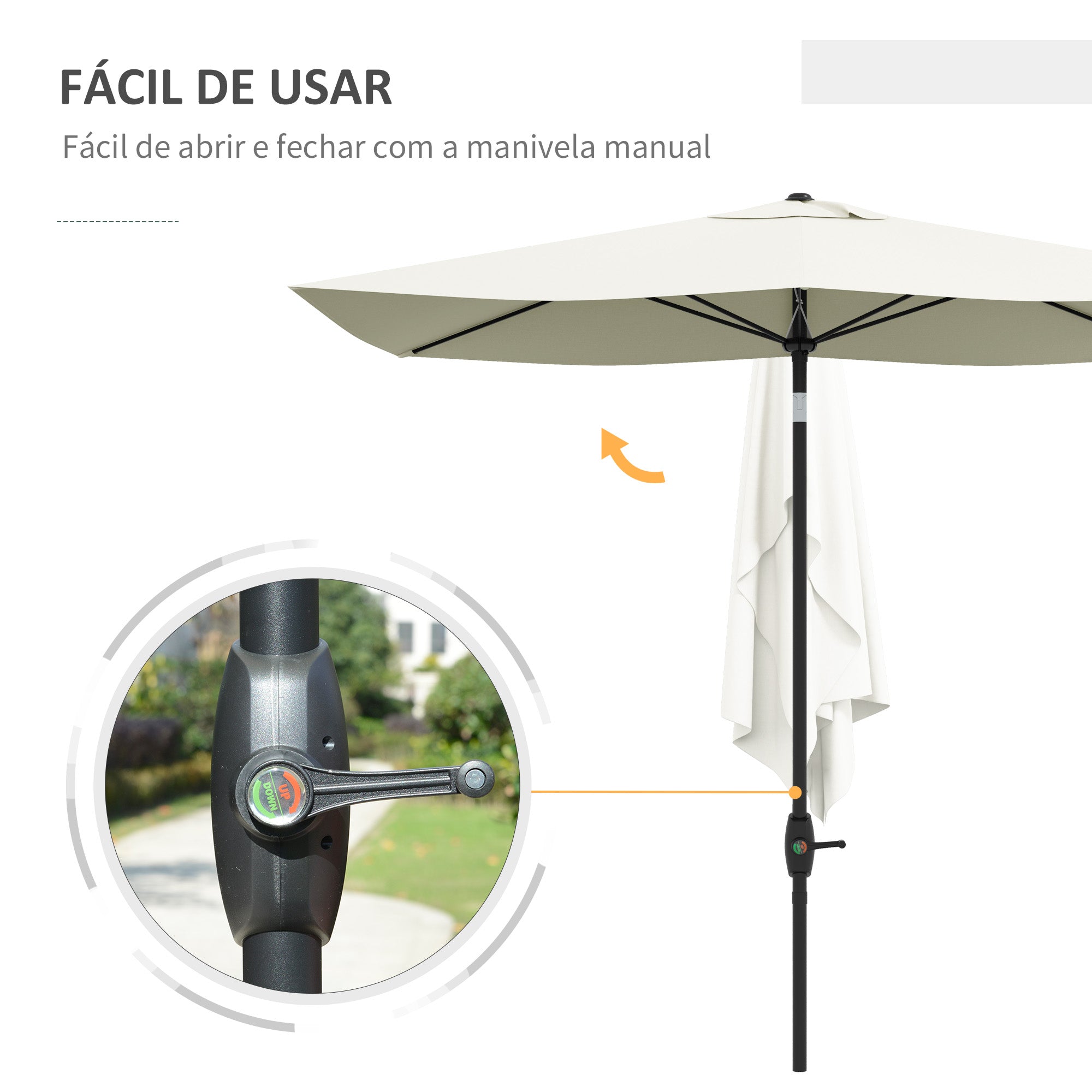 - ABERTURA E FECHAMENTO A MANIVELA: Chapéu de sol muito fácil de usar graças a seu mecanismo de abertura e fechamento mediante manivela manual. A manivela está situada no mesmo mastro pelo que será muito fácil de utilizar e regular segundo suas necessidades