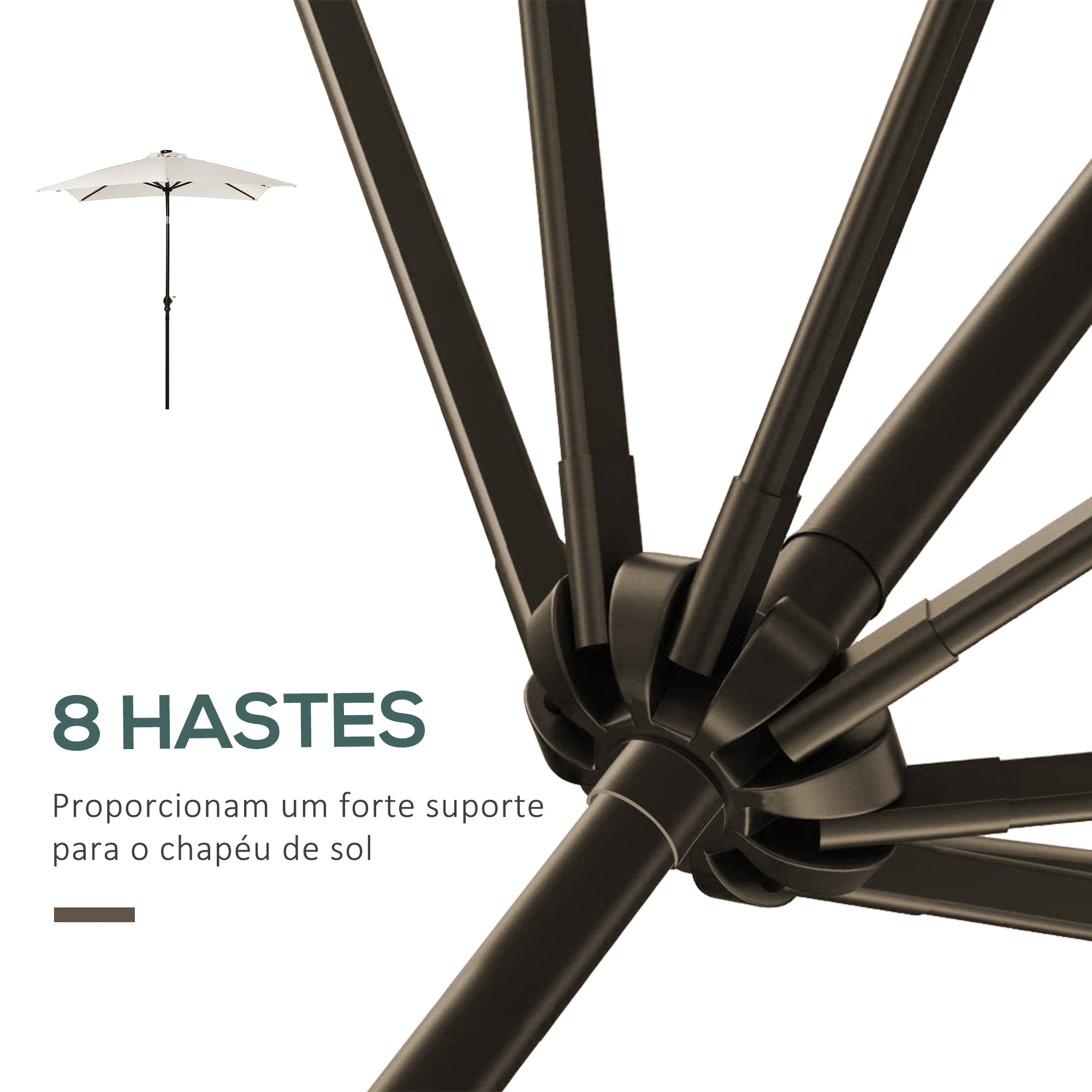 - 1 x Manual de instruções Este chapéu de sol com luzes LED da Outsunny é ideal para proteger contra os raios solares durante o dia e oferecer iluminação durante a noite. Com 30 luzes LED e um painel solar, este chapéu de sol consegue fornecer até 4 horas de iluminação durante a noite. Pode ser facilmente aberto através da manivela no mastro e possui um ângulo de inclinação de até 45°, perfeito para ajustar conforme as incidências dos raios solares. Não é mesmo ideal?