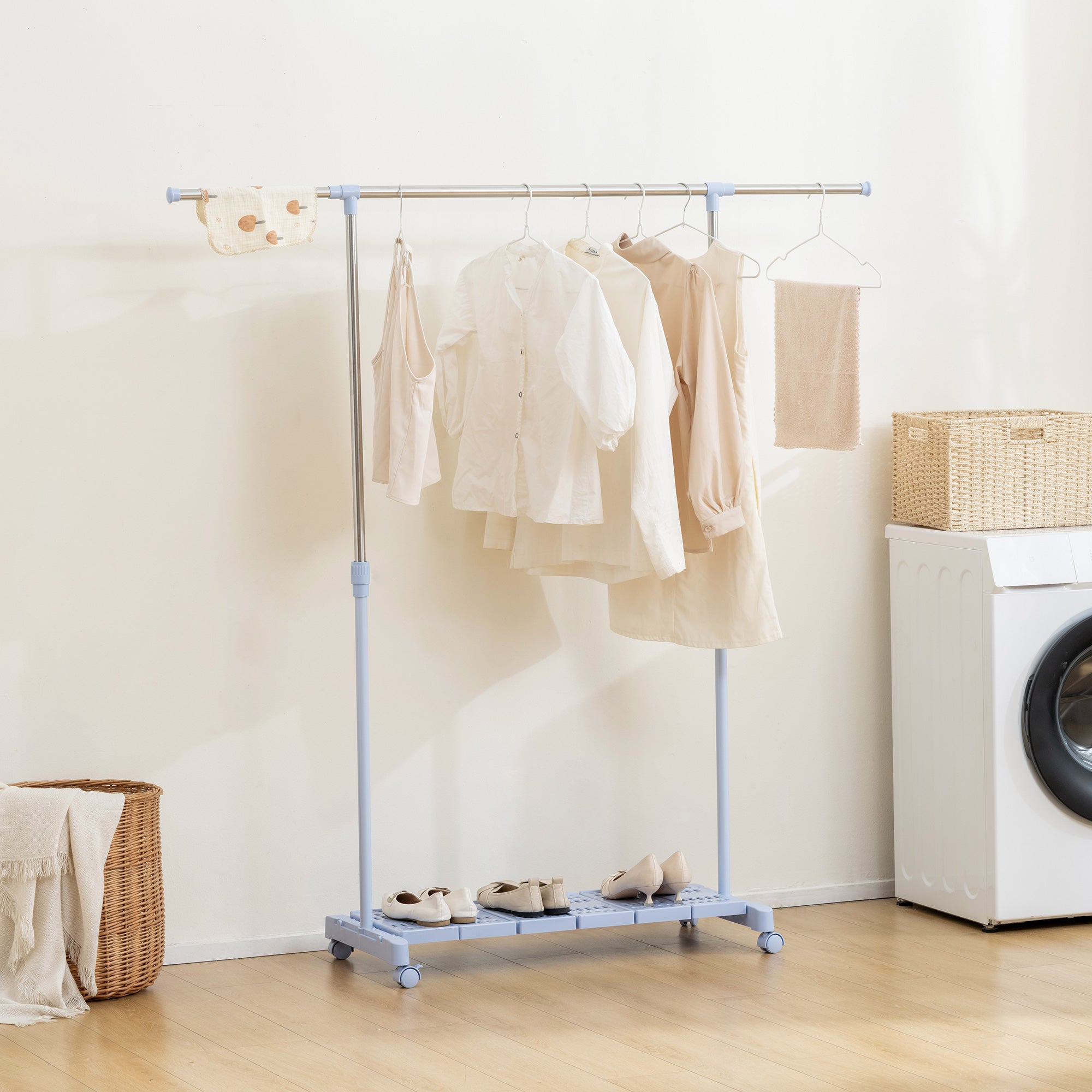 Charriot Extensível com Rodas Charriot de Roupa com Barra de Aço Inoxidável e Prateleira para Sapatos Altura Ajustável para Interior 94-159x42x93-168 cm Azul e Prateado