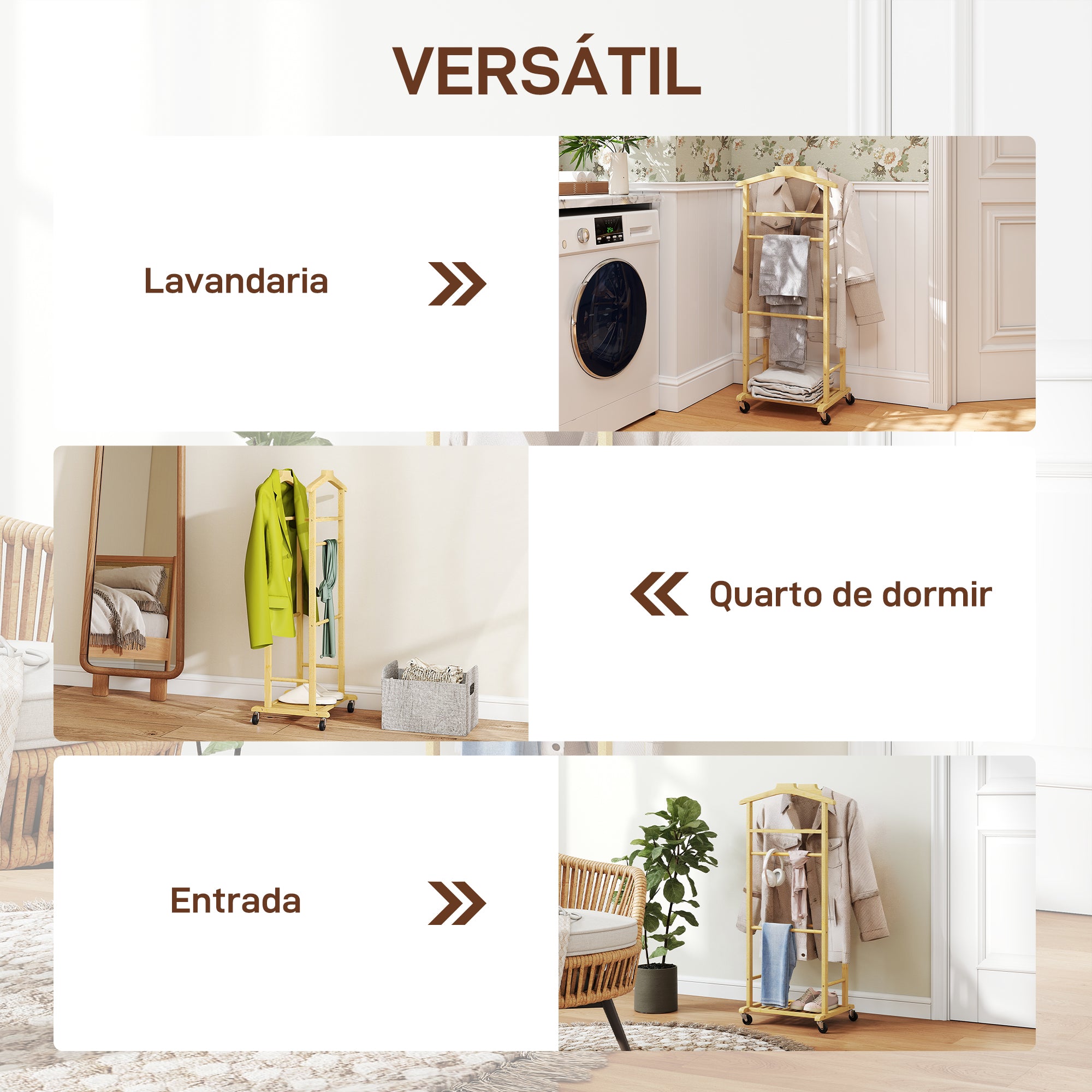 - Este cabide para roupas conta com dois cabides para casacos, duas barras para calças, bandeja e sapateira A bandeja prática permite organizar pequenos acessórios como chaves, carteira ou relógio Este cabide com quatro rodas suaves, duas com travão, oferece mobilidade e estabilidade ao colocá·lo Fabricado em bambu envernizado, combina resistência com um estilo quente e natural O seu design compacto adapta·se a corredores, quartos ou cantos pequenos A montagem é rápida e simples, em apenas 15 minutos seguindo as instruções