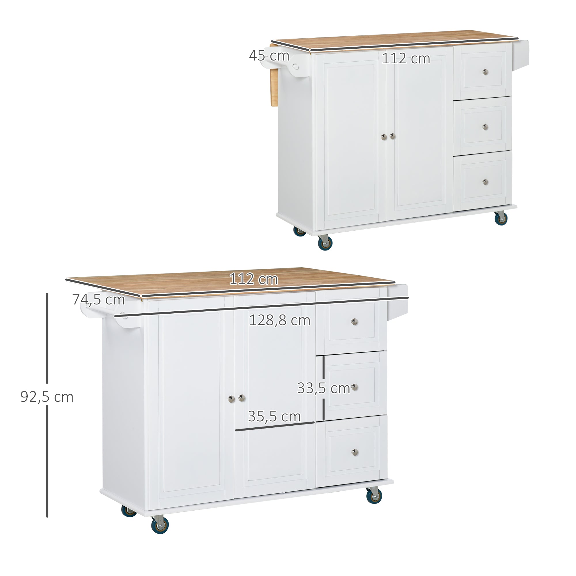 - MEDIDAS TOTAIS: 128,8X75,X92,5cm (CxLxA). Medidas da bancada: 112x45cm (CxL). Medidas da bancada desdobrada: 112x74,5cm (CxL). Medidas do interior do armário: 70x36x79,5cm (CxLxA). Capacidade máxima de peso: 65kg (total) e 5kg (gaveta). Requer montagem Organize seus utensílios de cozinha com este carrinho de cozinha de HOMCOM. Conta com 1 armário, 3 gavetas e uma bancada espaçosa. Oferece um amplo espaço de armazenamento e ajuda a manter tudo organizado. As 4 rodas facilitam o movimento e você pode mover o carrinho para a sua sala de jantar ou sala de estar. Além disso, a bancada rebatível oferece um espaço extra em sua cozinha. A combinação do branco e madeira natural, torna