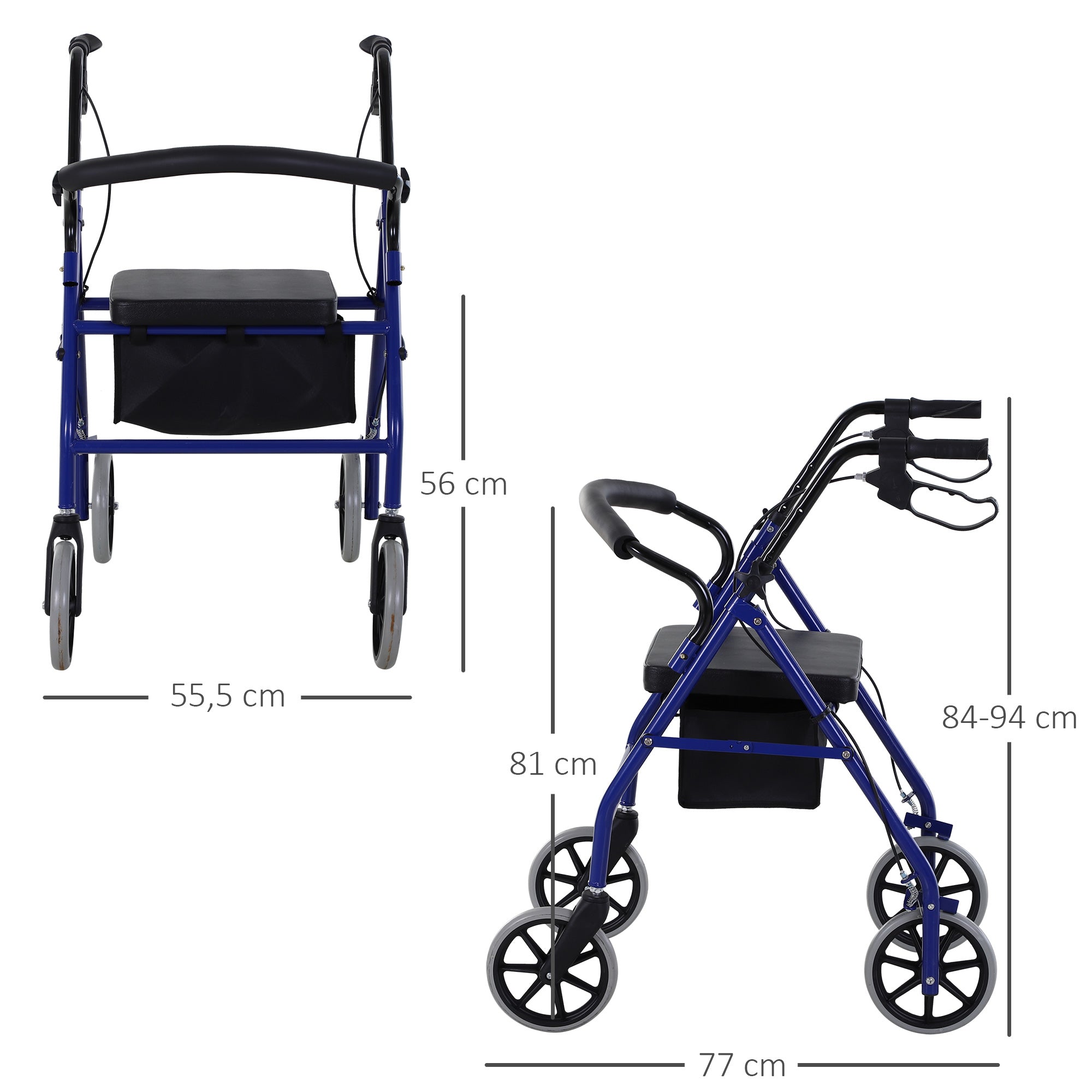 - MEDIDAS: 77x55.5x84-93 cm (CxLxA). Dobrado: 55x34x78 cm (CxLxA) A HOMCOM apresenta este fantástico andador adulto dobrável com assento e bolsa de armazenamento. Ele pode ser ajustado em 4 níveis diferentes de altura e possui freios embutidos em suas alças. Isso, juntamente com suas rodas práticas, torna muito confortável e fácil de dirigir. Como ele carrega uma prática bolsa de armazenamento, você pode fazer longas caminhadas e guardar o que precisará. Ser dobrável, tanto de transporte de carro quanto de loja em casa, é muito simples.