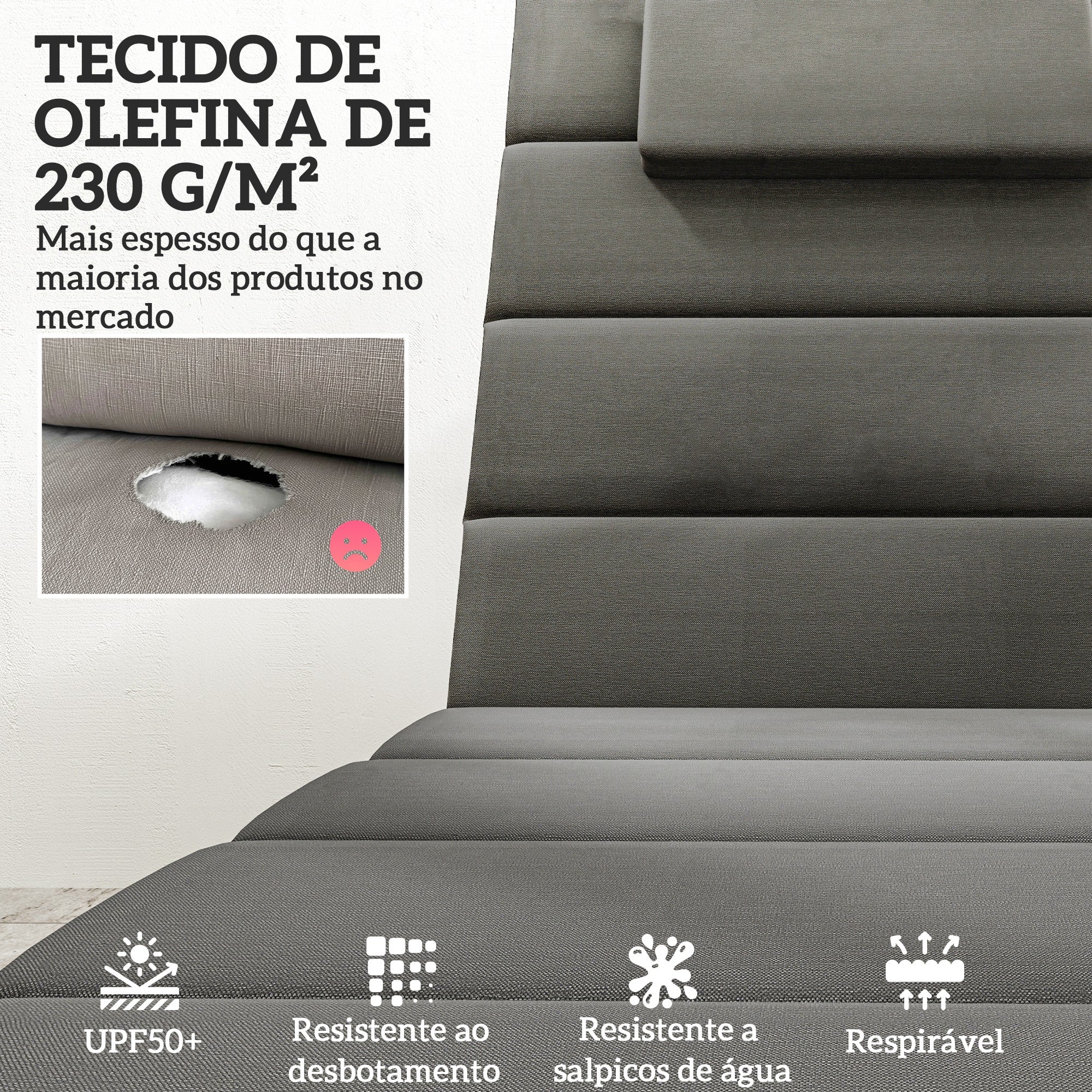 • 2 x Almofadas para espreguiçadeiras; Renove as suas espreguiçadeiras com este conjunto de almofadas da Outsunny com encosto. Fabricados em Olefin 230gsm com proteção UPF50+, são resistentes à descoloração e à água. O acolchoado compartimentado oferece conforto duradouro, e o apoio para a cabeça integrado é perfeito para relaxar ao sol. Além disso, podem ser dobrados para um armazenamento fácil