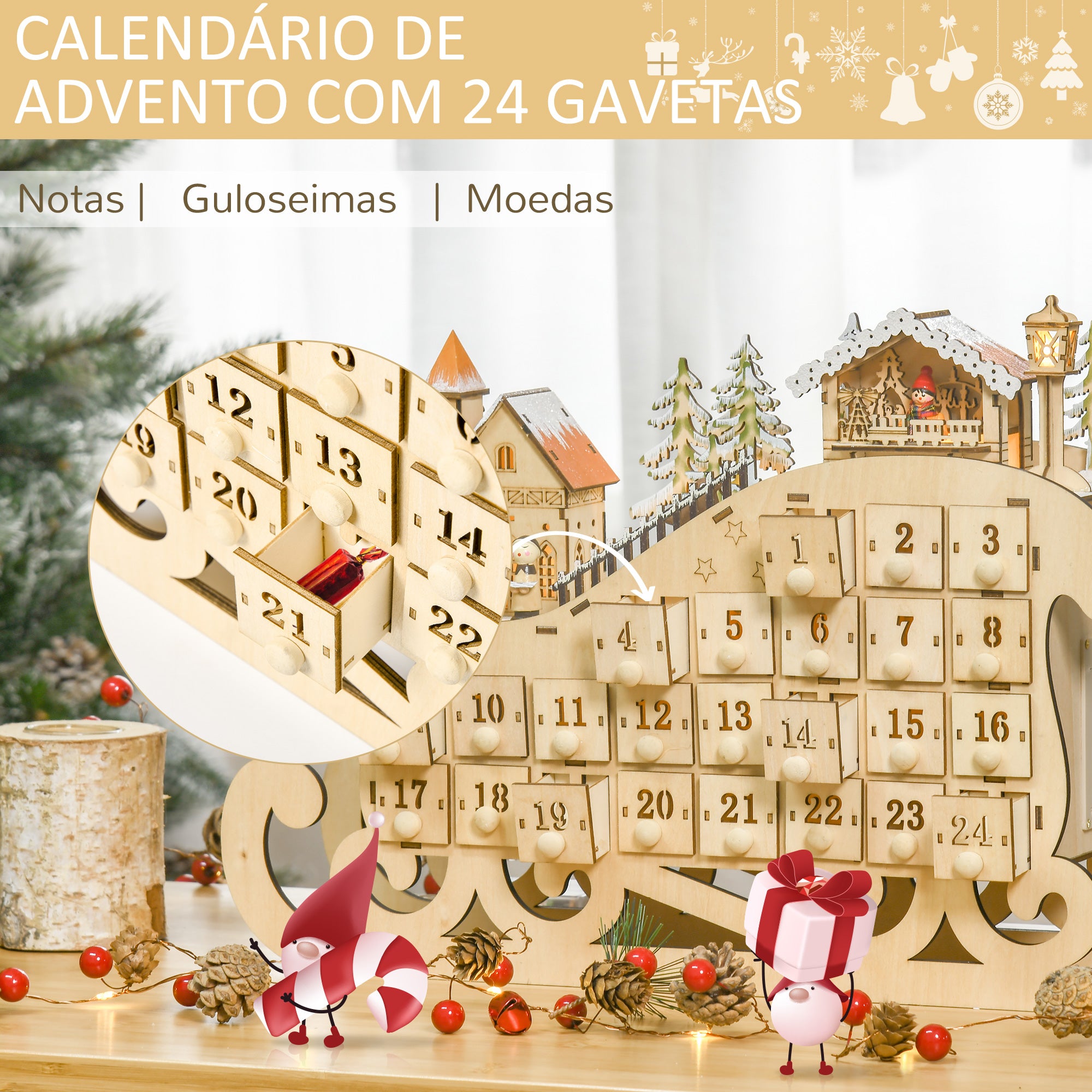 - MEDIDAS TOTAIS: 45x10x31cm (CxLxA). Este produto requer 2 pilhas AA para seu funcionamento (não incluídas). Requer montagem Decore sua casa para o Natal com esse Calendário de Advento de HOMCOM que é perfeito para componer com sua decoração de Natal. Coloque guloseimas, bilhetes com prêmios ou jogos para que os pequenos abram um por dia e se divirtam. É perfeito para você e seus filhos se divertirem e entrarem no clima natalino contando os dias para o Natal. Use para decorar mesa da entrada, consolo da lareira ou inclusive no chão perto da árvore de natal. Faça com que o clima de Natal chegue em todas as partes!