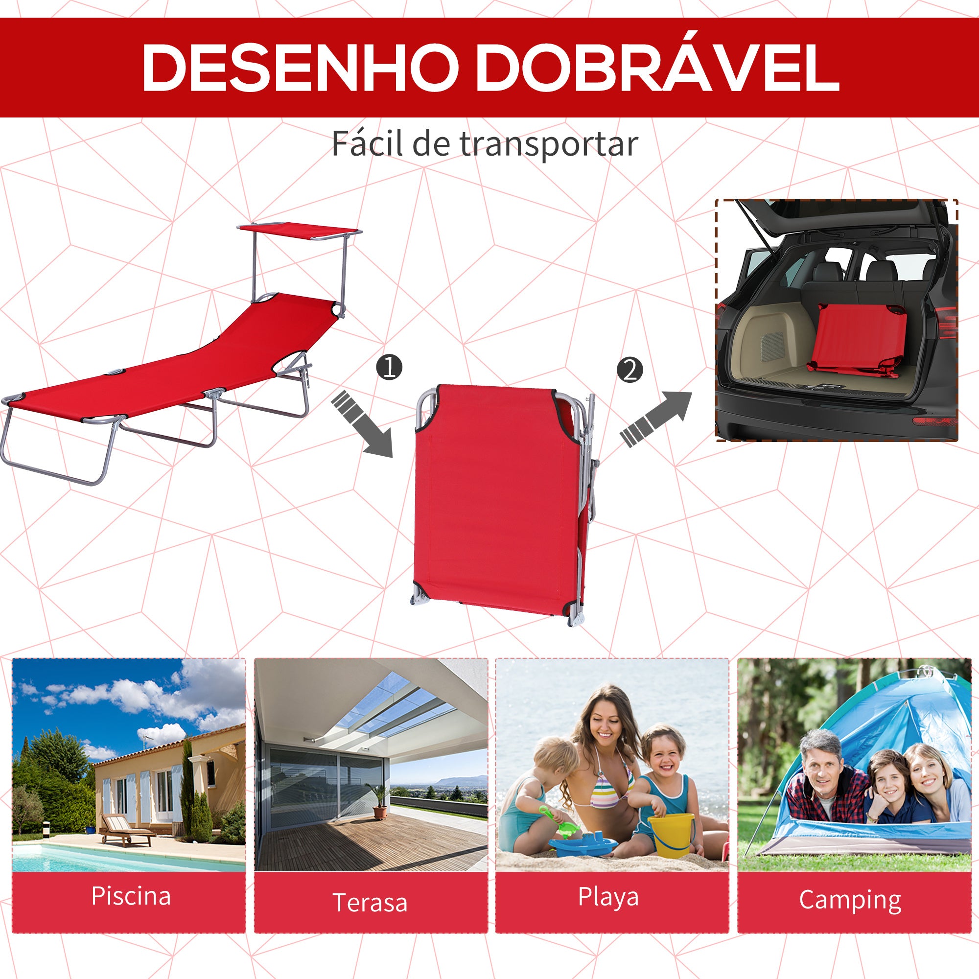 - DOBRÁVEL E PORTÁTIL: Graças ao seu desenho dobrável esta espreguiçadeira pode ser dobrada de forma muito compacta, economizando espaço de armazenamento e facilitando o transporte. Ideal para viagens à praia, acampamentos, etc.