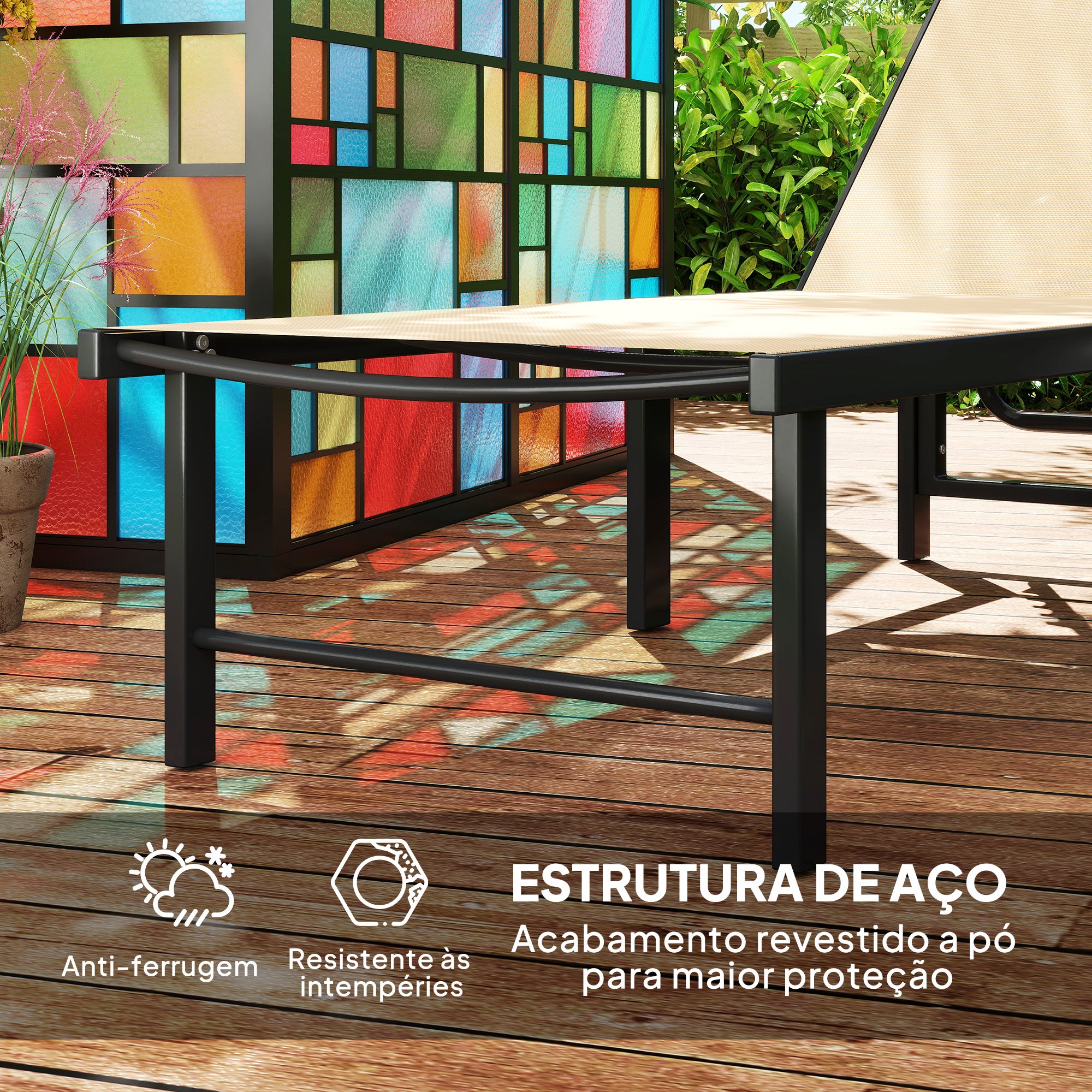 - Esta espreguiçadeira de jardim exterior possui um encosto reclinável em quatro posições, permitindo·lhe relaxar no ângulo que preferir Totalmente reclinável para proporcionar um maior relaxamento Assento em textilene respirável para uma sensação fresca em dias quentes Tecido de 550 g/m² mais resistente ao desgaste ou rasgões Estrutura em aço com revestimento em pó para uma base sólida e durável Almofadas protetoras nos pés para evitar riscos no chão Esta espreguiçadeira reclinável requer uma montagem simples