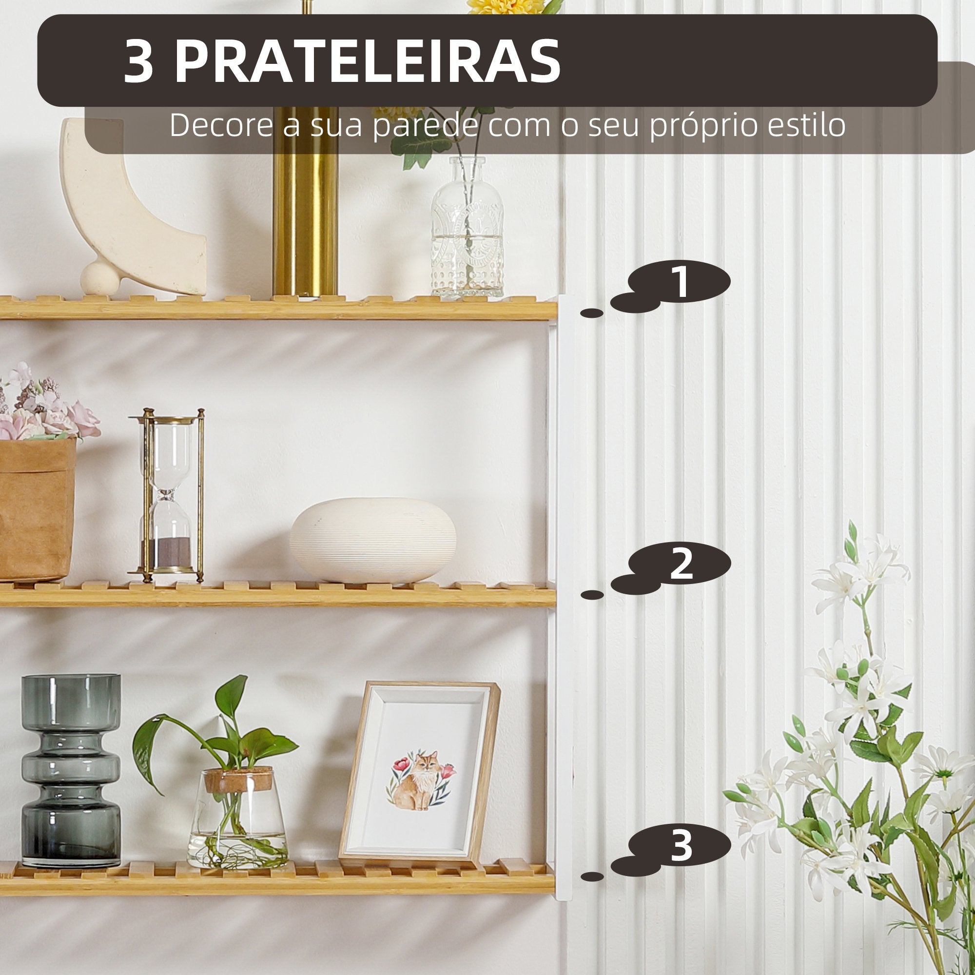 • MEDIDAS TOTAIS: 60x15x54cm (CxLxA). Capacidade máxima de peso: 6kg (total) e 2kg (cada prateleira). Requer montagem Para quadros, plantas, para suas memórias favoritas … esta estante de parede da HOMCOM é ideal para exibir e expor as suas decorações favoritas. Basta fixar em um lugar onde você quiser, seja o quarto, corredor, sala ou cozinha. Fabricada em bambu para maior resistência e estabilidade, esta estante flutuante é ideal para uma utilização prolongada. Além disso, o seu bonito desenho e combinação das cores madeira e branco, combinará em qualquer espaço e decoração em sua casa