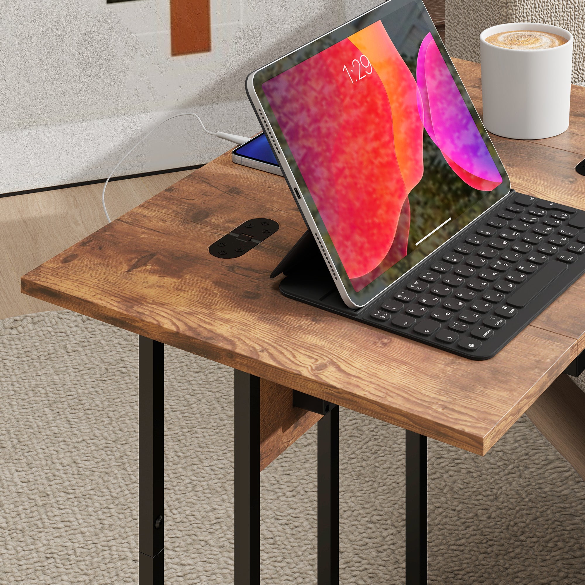 - Expanda a superfície da mesa para obter mais espaço ou dobre·a para poupar espaço A estação de carga inclui duas tomadas, uma porta USB e uma porta USB·C O desenho em forma de C desliza facilmente sob os móveis ou adapta·se a espaços pequenos Tubos metálicos resistentes e melamina de madeira de alta qualidade garantem durabilidade A estrutura preta e a superfície superior em tom madeira rústica acrescentam um toque industrial Os pés ajustáveis proporcionam estabilidade em superfícies irregulares Perfeita como mesa de cabeceira, mesa de café, mesa auxiliar ou mesa para snacks Fácil de montar