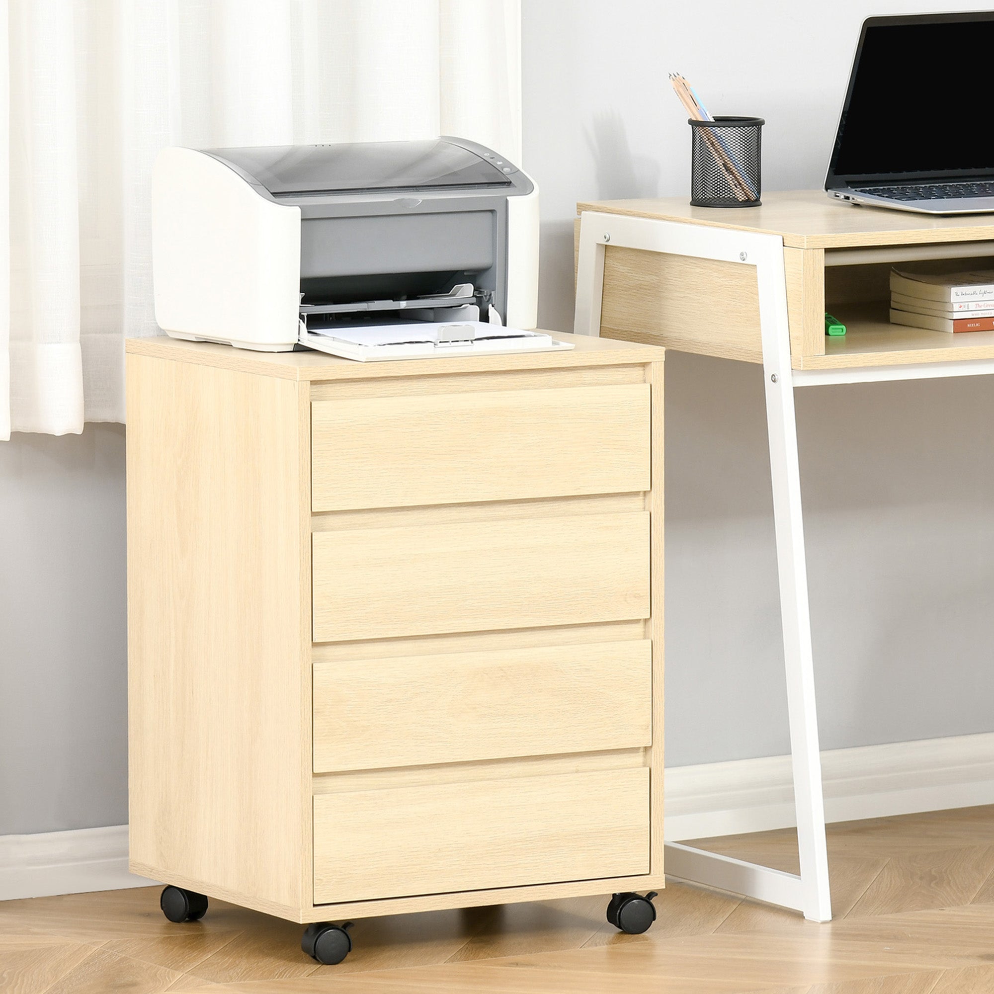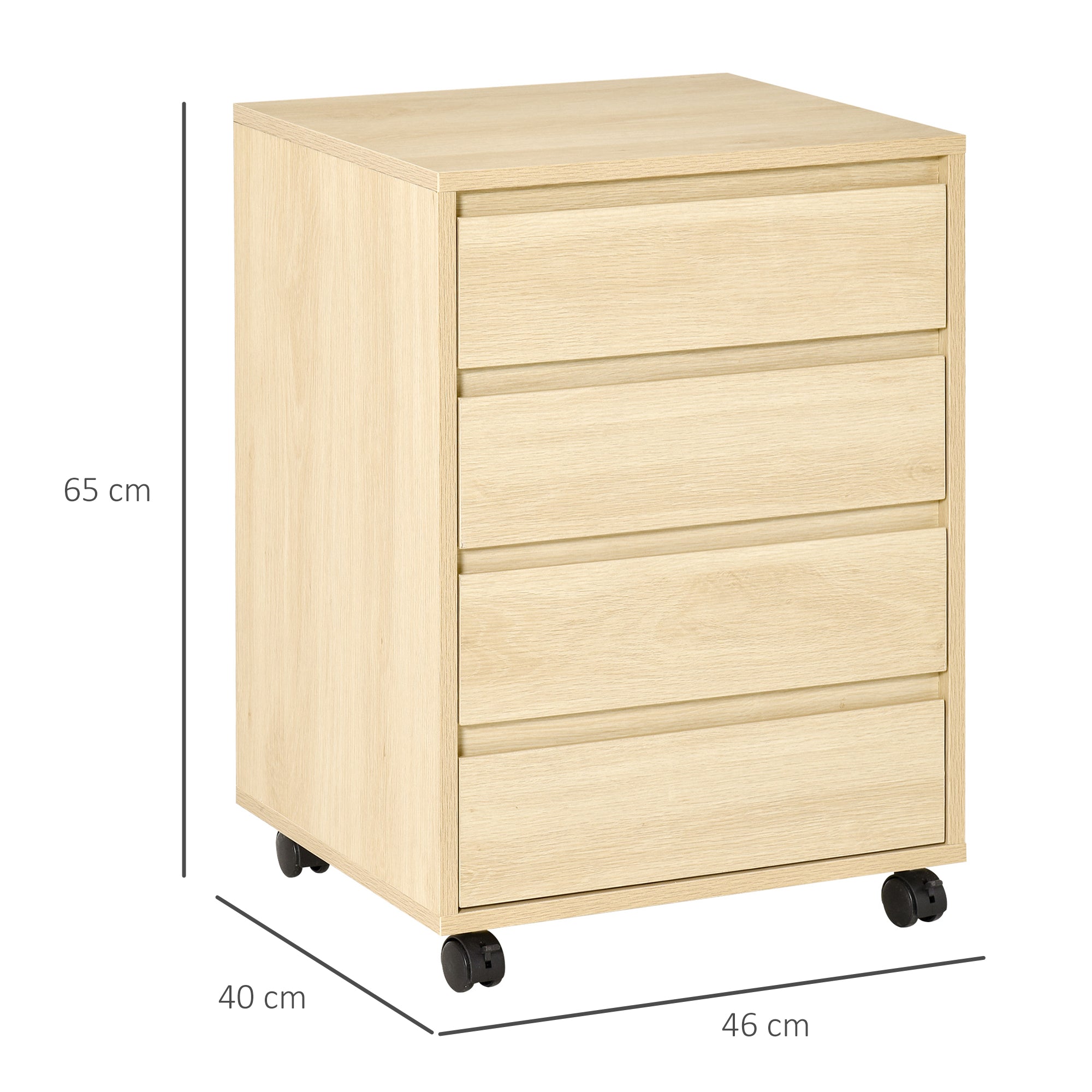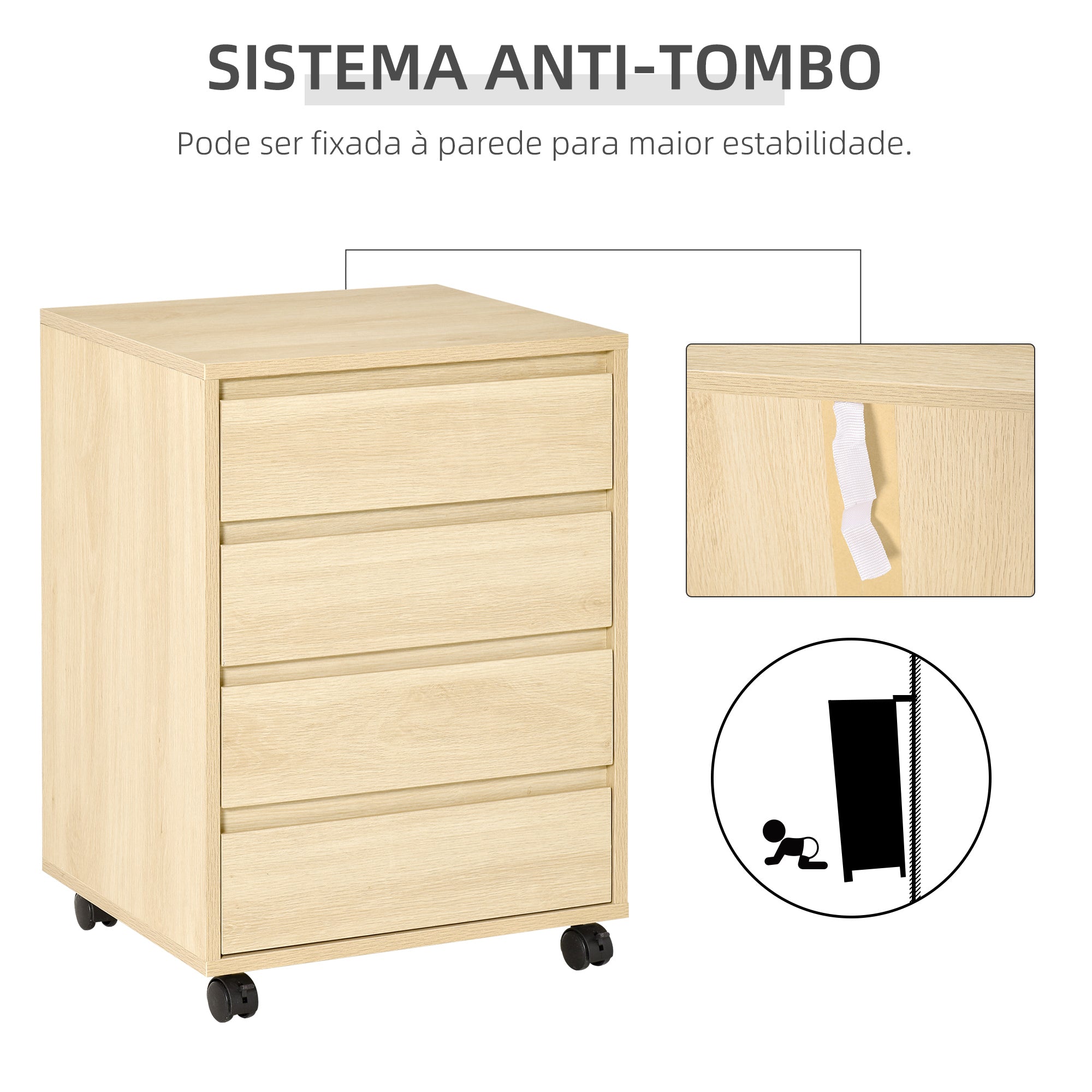 • O tamanho compacto adapta·se facilmente à maioria dos escritórios e salas de estudo As quatro gavetas espaçosas permitem organizar documentos e materiais de forma prática As rodas facilitam a movimentação, sendo duas com travão para maior estabilidade A estrutura em MDF E1 com proteção anti·tombo garante resistência e segurança O acabamento em madeira combina facilmente com qualquer estilo de decoração A capacidade máxima de carga é de 20 kg Requer montagem
