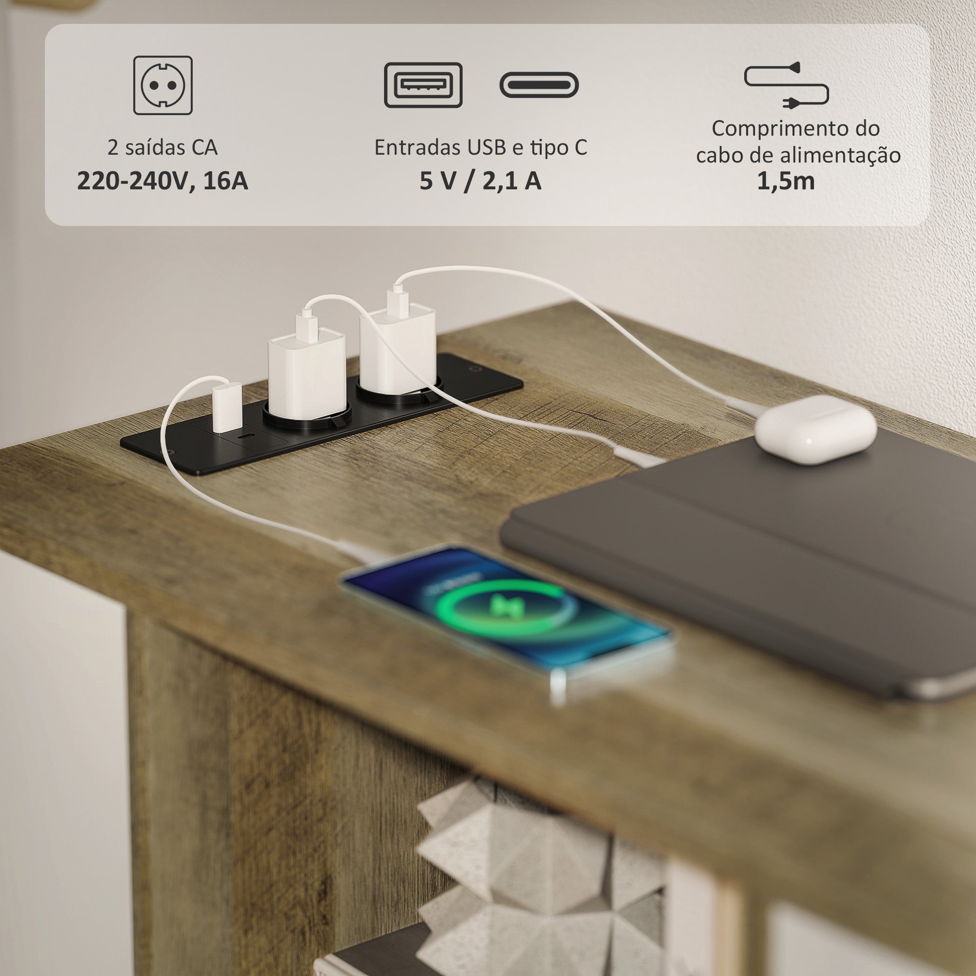 • Cor: Marrom acinzentado e branco Material: Melamina de madeira Medidas totais: 100x40x65,5 cm (CxLxA) Medidas do interior da gaveta: 37,5x34x6,5 cm (pequena) e 36x34x25 cm (grande) Medidas de cada compartimento central: 40x38x28,5 cm (CxLxA) Medidas da arrumação lateral: 37x18x57 cm (CxLxA) Comprimento do cabo de alimentação: 1,5 m Carga máxima: 49 kg (total), 15 kg (bancada), 5 kg (prateleira) e 3 kg (gaveta) Voltagem: AC 220·240V, 50/60Hz, 16A USB/Tipo C: DC 5V, 2.1A Potência máxima: 2400W Referência: 924·103V90GY O pacote inclui:
