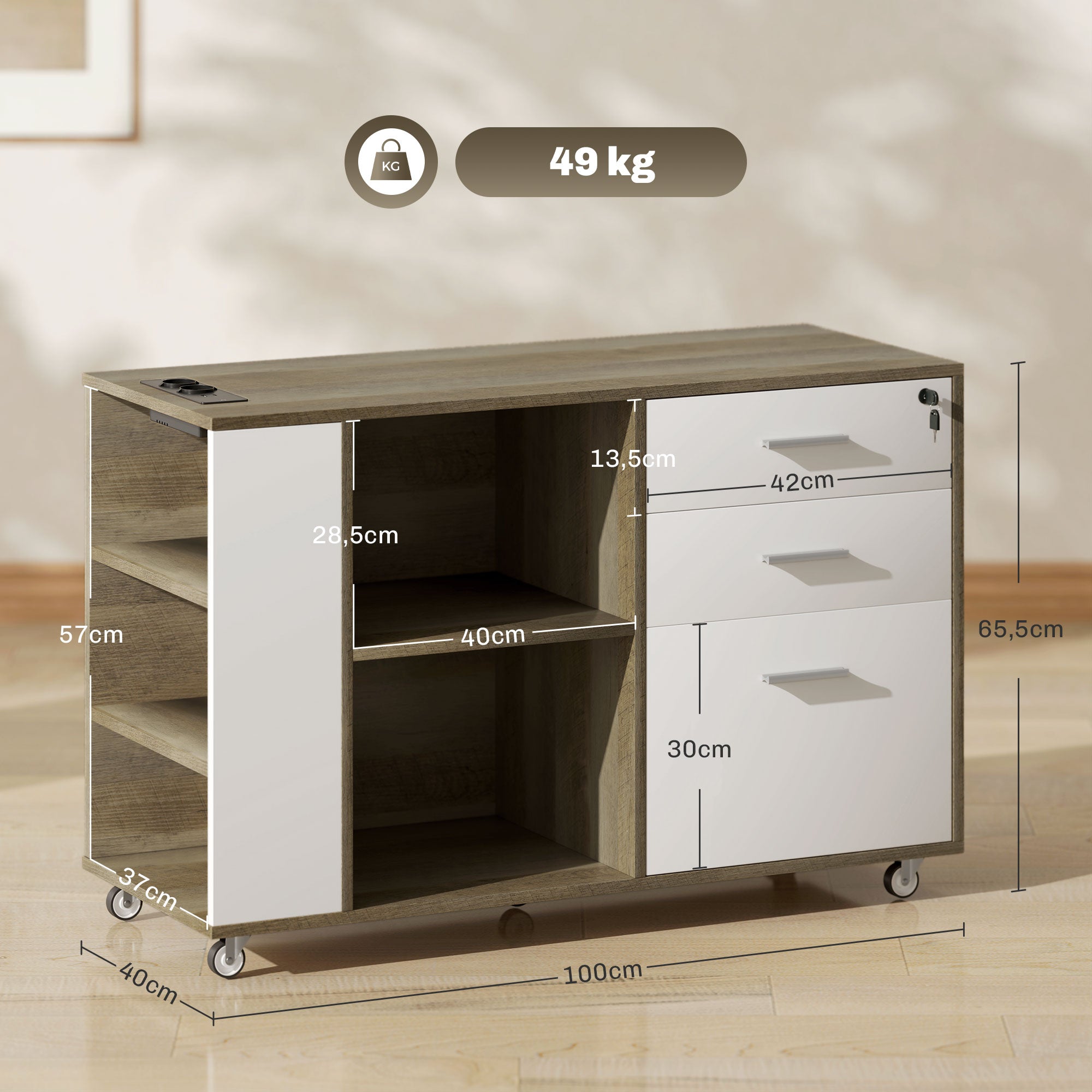 • Arquivador ideal para manter o seu escritório sempre organizado Equipado com 2 tomadas elétricas, entrada USB e entrada Tipo C para carregamento fácil Cinco compartimentos e três gavetas que maximizam as opções de armazenamento Gaveta grande com barra suspensa ajustável, compatível com documentos A4 e carta Compartimentos laterais com prateleiras ajustáveis para uma organização personalizada Gaveta superior com fechadura para proteger documentos importantes Cinco rodas para mobilidade, duas com travão para uma parada segura e uma roda central para maior estabilidade Superfície em melamina fácil de limpar Requer montagem