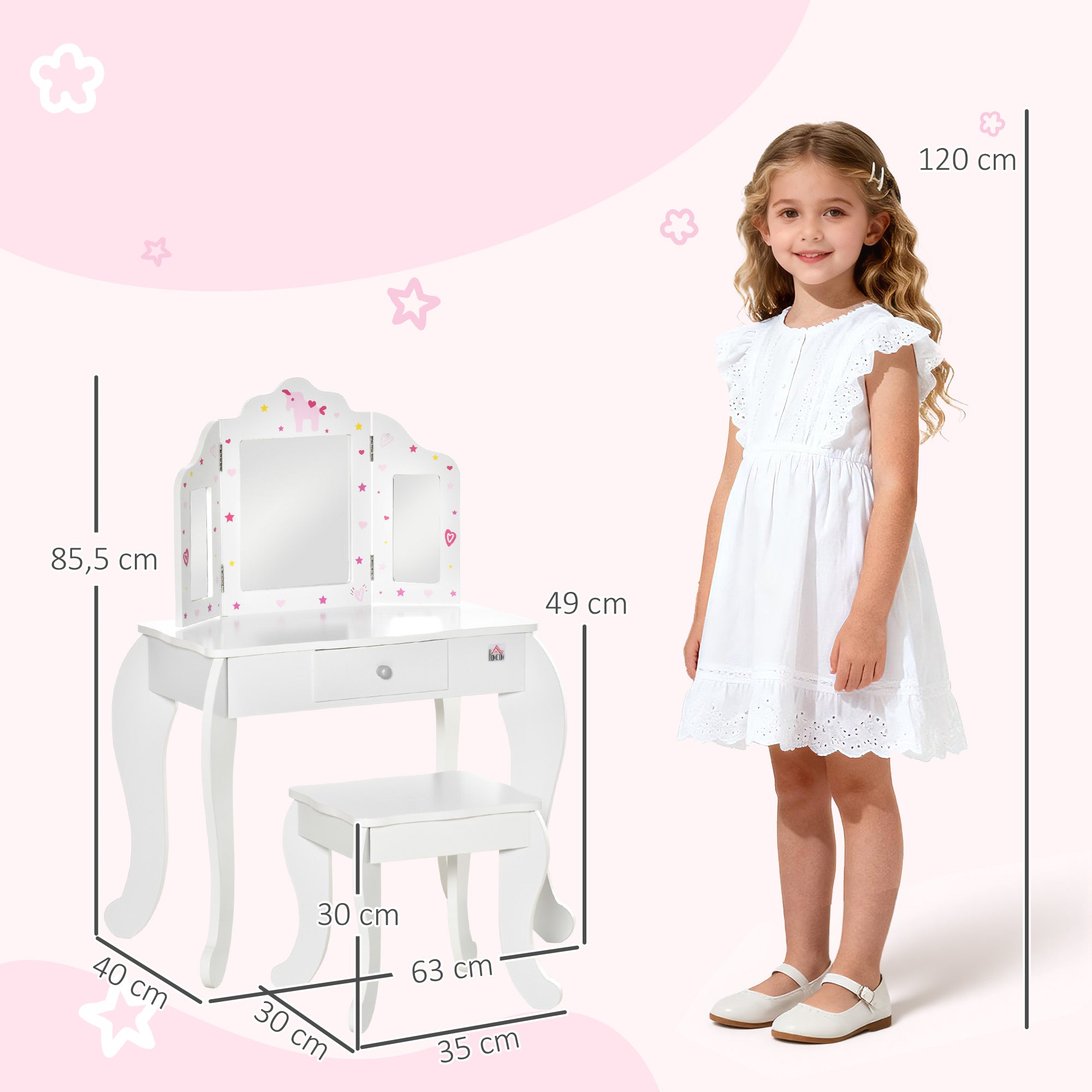 Toucador Infantil de Madeira com Banco e Espelho de Acrílico de 2 Sessões Mesa de Maquilhagem Infantil com Gaveta para Dormitório Sala de Jogos 63x40x85,5cm Branco
