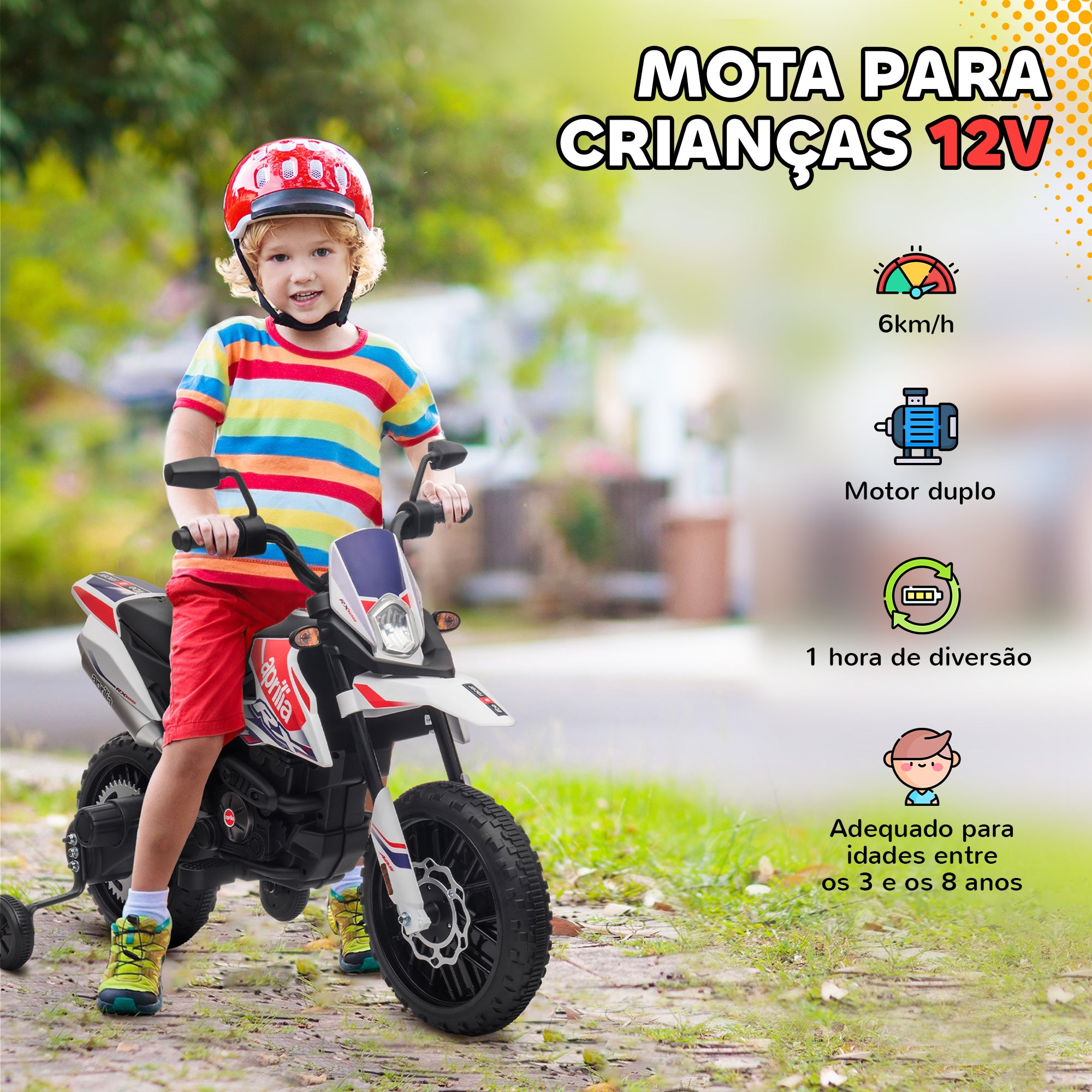 - Esta mota elétrica infantil com licença oficial Aprilia oferece um design desportivo e realista Inclui rodinhas de treino removíveis que facilitam a aprendizagem segura Conta com amortecedor traseiro para suavizar os percursos Os seus dois motores de 12V permitem até 1 hora de uso contínuo a 6 km/h Farol dianteiro funcional, porta USB e música integrada para maior diversão Indicador de bateria para controlar facilmente a autonomia Rodas grandes de Ø33,5 cm em PP que garantem estabilidade Recomendada para crianças dos 3 aos 8 anos
