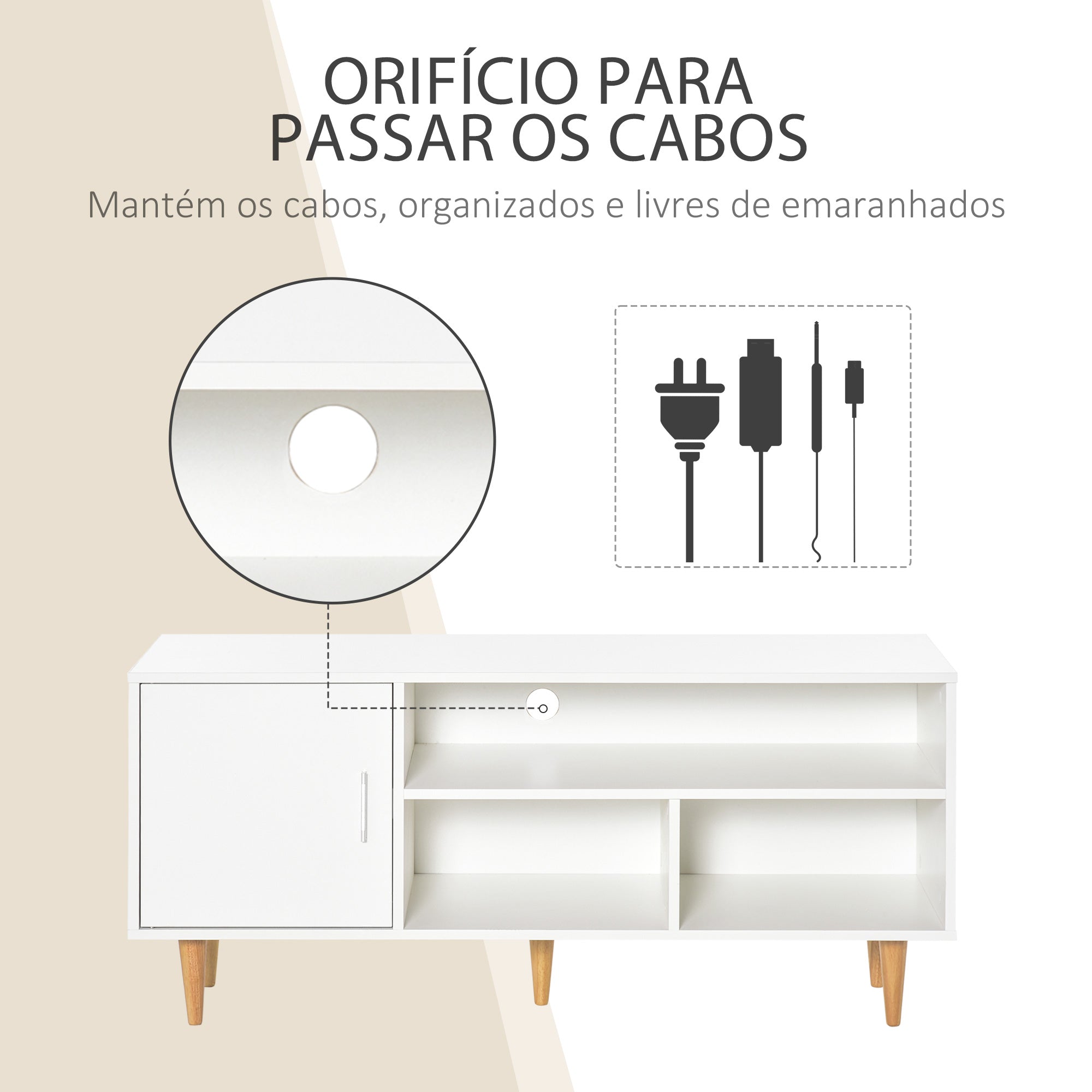 - Móvel de TV com 5 pés de madeira maciça para uma maior estabilidade e evitar a umidade