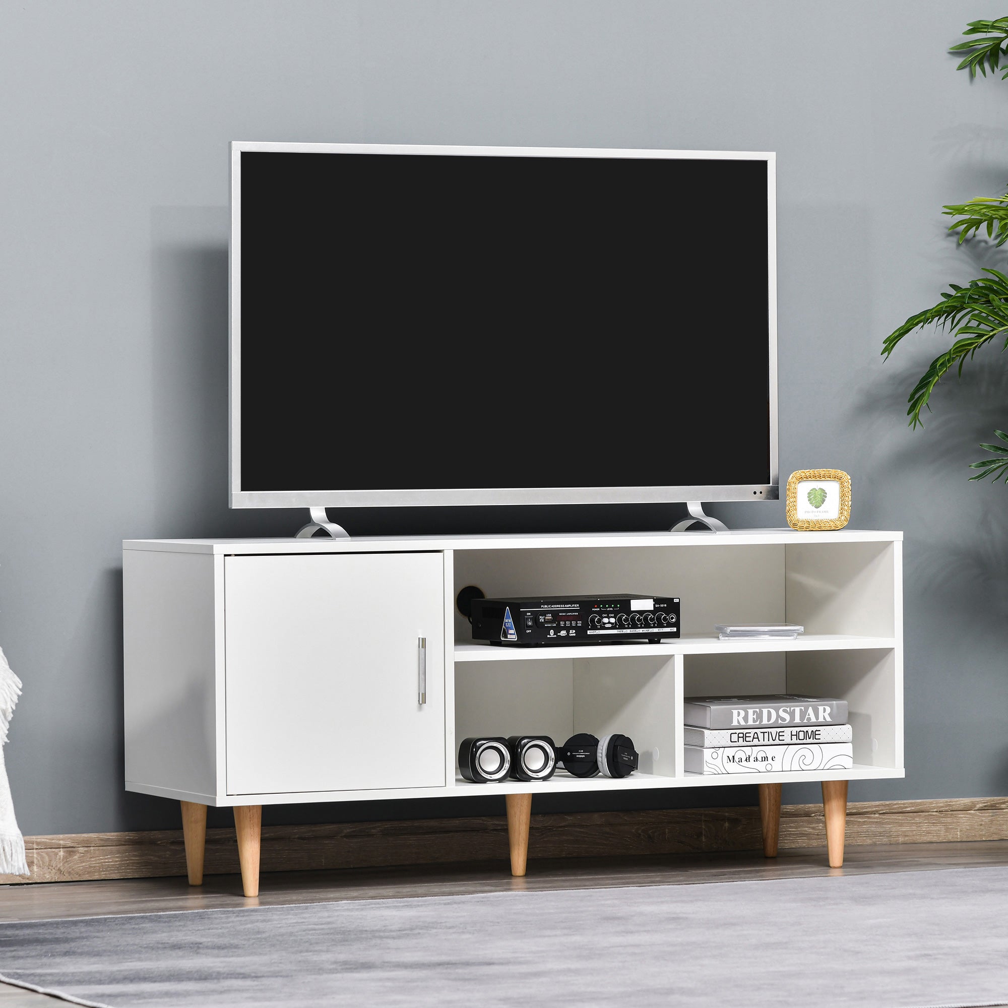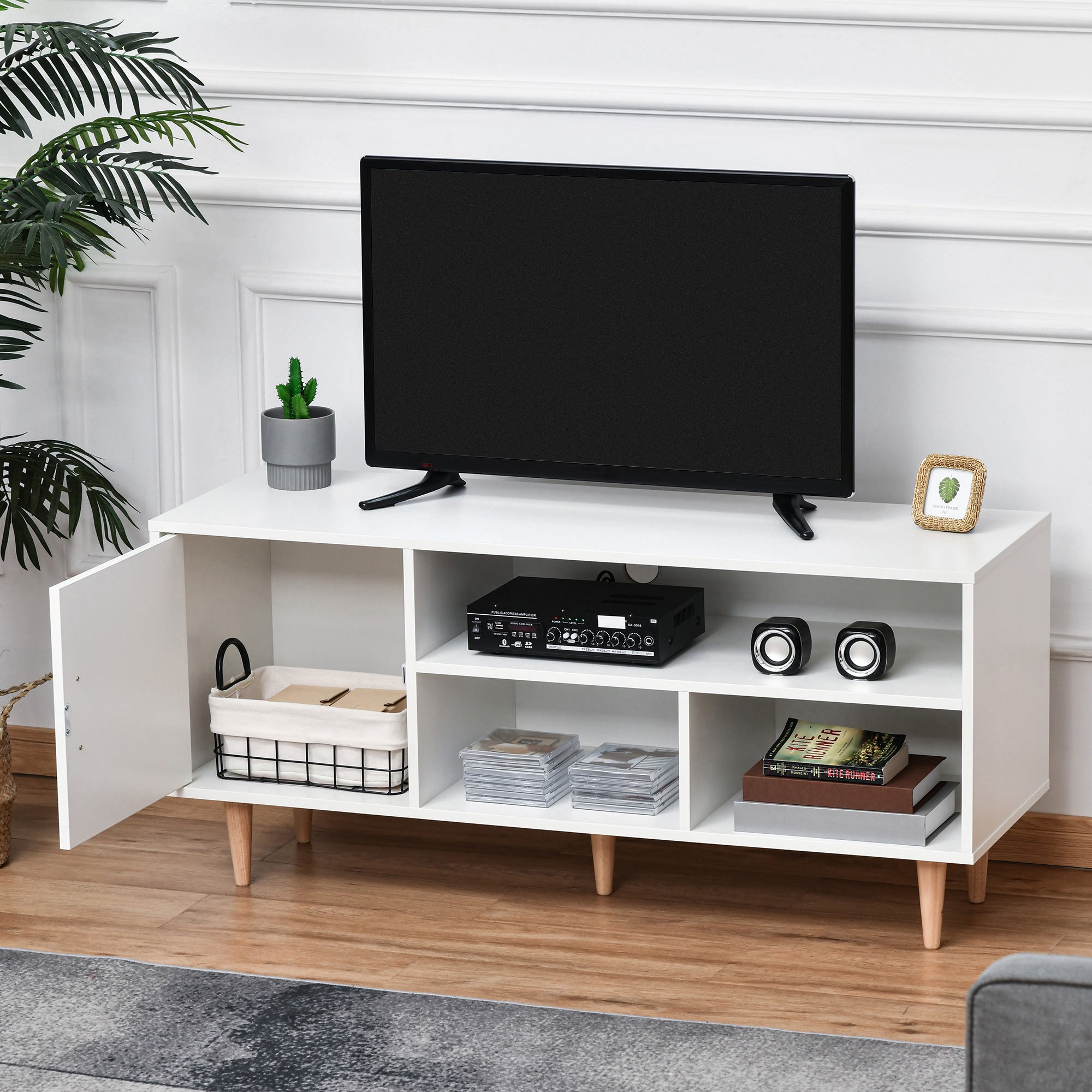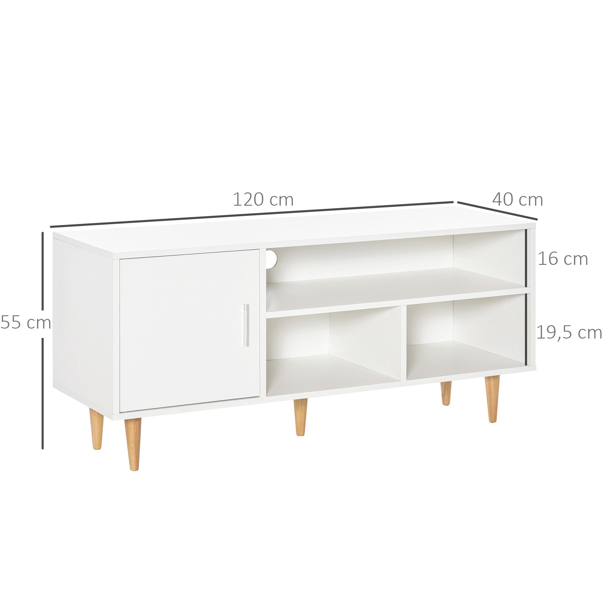 - MEDIDAS TOTAIS: 120x40x55cm (CxLxA); Capacidade de carga: 50 kg (total), 5 kg (prateleira). Apta para TVs de até 60 polegadas Você está buscando um móvel de TV com amplo espaço de armazenamento? Então você vai amar esse móvel de TV de até 60 polegadas de HOMCOM. Conta com um armário e 3 compartimentos abertos para satisfazer suas necessidades de armazenamento e ao mesmo tempo te ajudar a que sua sala de estar fique mais organizada. E também conta com um orifício para passar os cabos na parte traseira para que todos seus cabos fiquem organizados e livre de emaranhados. Este móvel é a solução perfeita para sua TV!