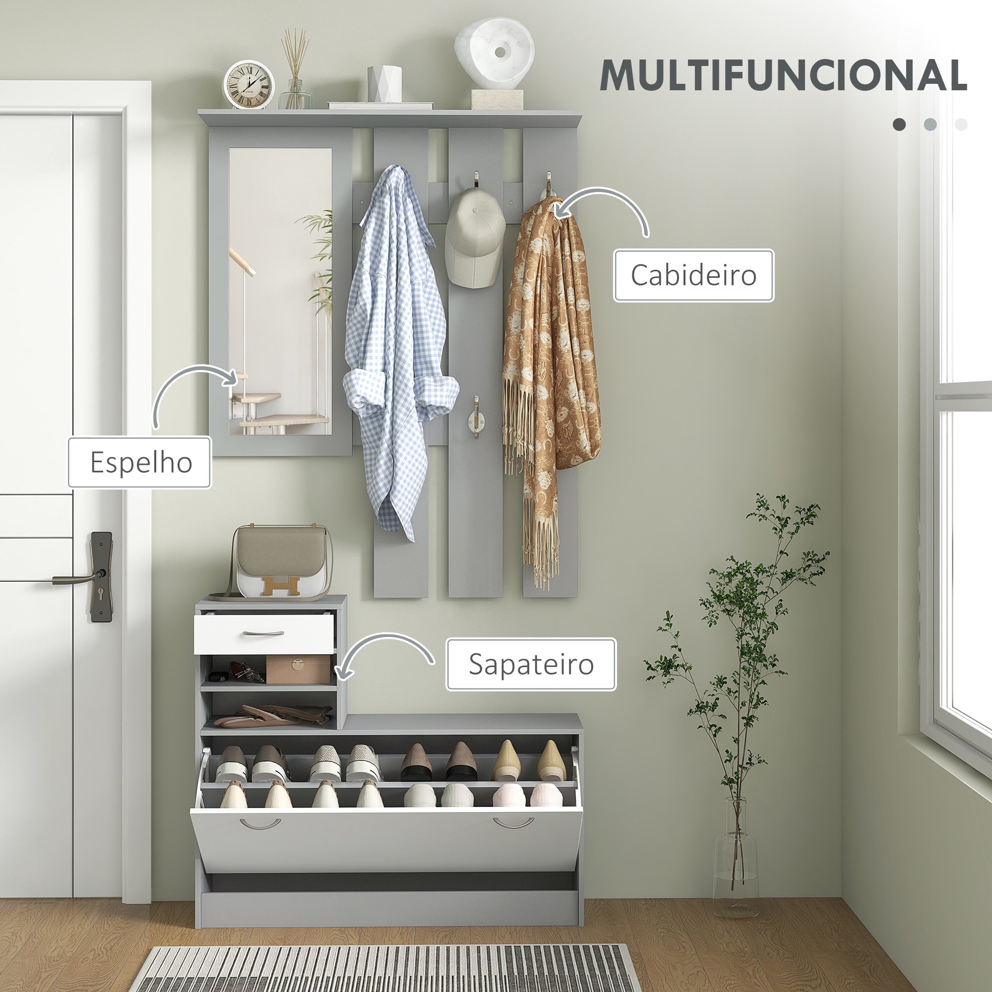 Móvel Cabide de Entrada de 3 Peças Armário de Entrada com Cabide Espelho Sapateira e Gaveta 90x10x102 cm Branco e Cinza