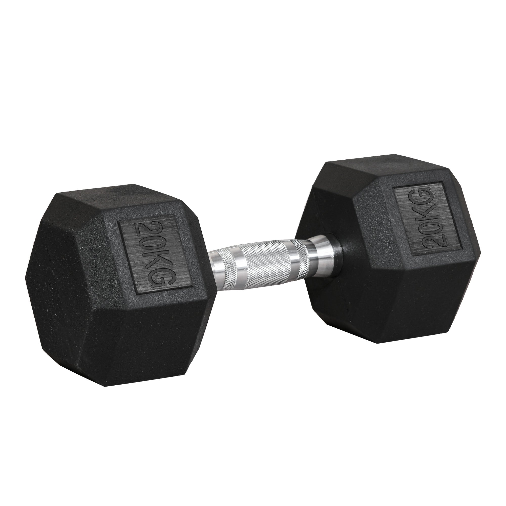 - Este haltere hexagonal de 20 kg é perfeito para fortalecer e tonificar os músculos Extremidades hexagonais revestidas em borracha que impedem que role Cabo cromado com textura estriada para uma pegada cómoda e segura O haltere de borracha pode ser utilizado em casa, no ginásio ou no escritório sem ocupar muito espaço Pronto a usar, não requer montagem e é fácil de guardar após o uso