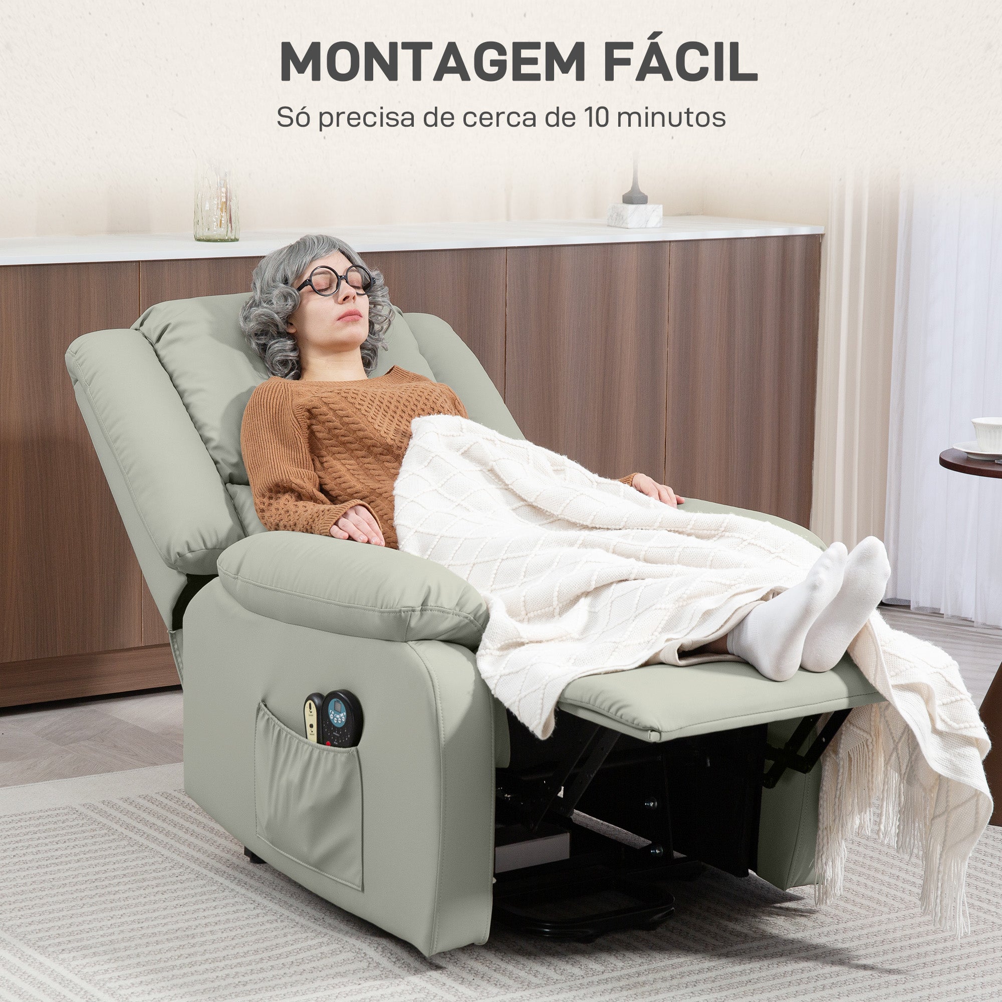 - Poltrona resistente e fácil de limpar Com elevação de 45° e reclinação de 155°, controlados através do controlo remoto Massagem por vibração em 8 diferentes pontos: costas, lombar, coxas e pernas Possui 4 modos de vibração Sistema de aquecimento na área lombar para um maior conforto O assento com espessura de 12 cm, encosto de 20 cm e o sistema de molas fornecem uma excelente poltrona para passar horas relaxando O bolso lateral é ideal para manter o controlo remoto e pequenos objetos sempre a mão Capacidade de até 150 kg Requer uma montagem rápida e fácil