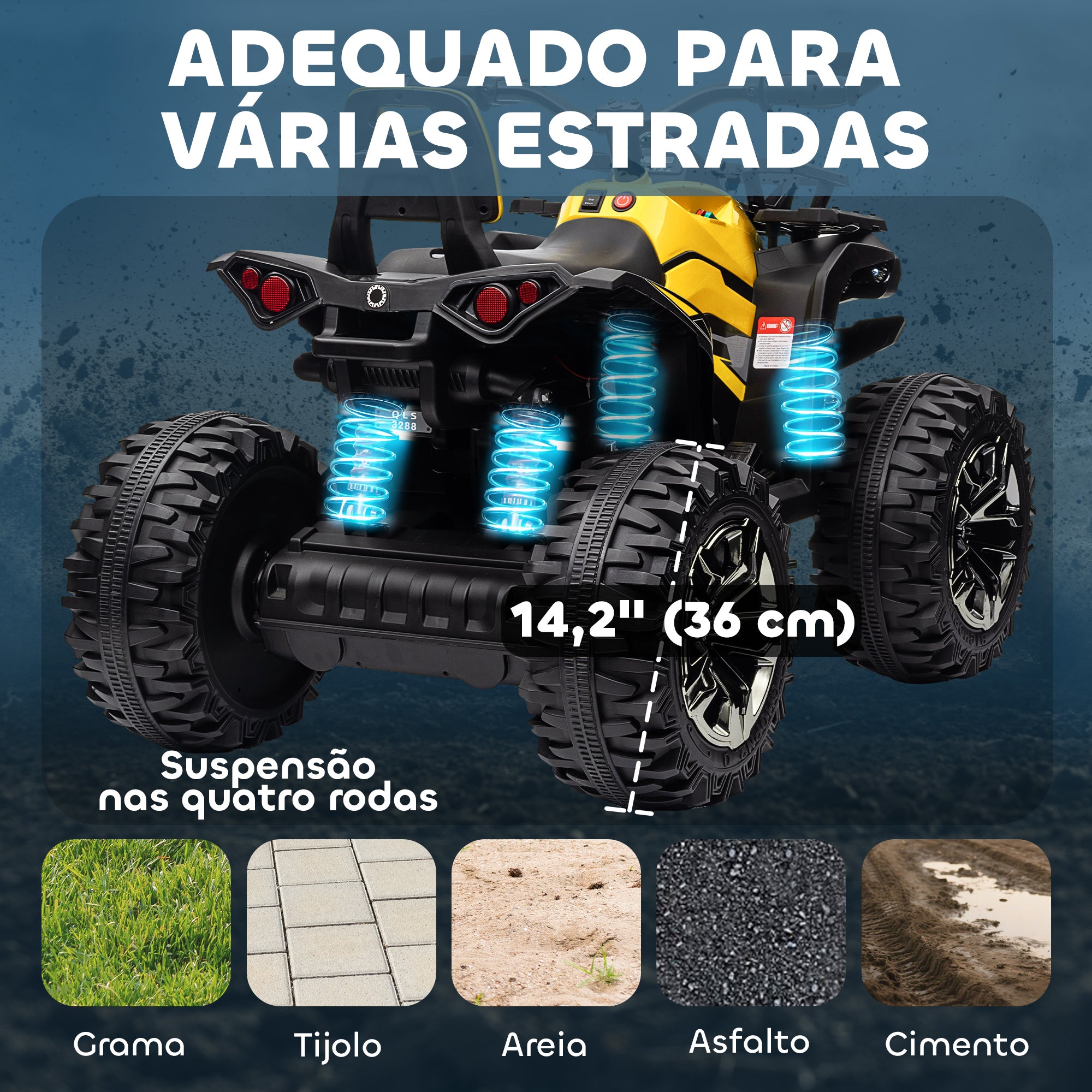 Quadriciclo Elétrico 12V para Crianças acima de 3 Anos com Farol Música Pneus de Suspensão Botões Avance e Retrocesso Veículo Elétrico a Bateria 100x65x73cm Amarelo