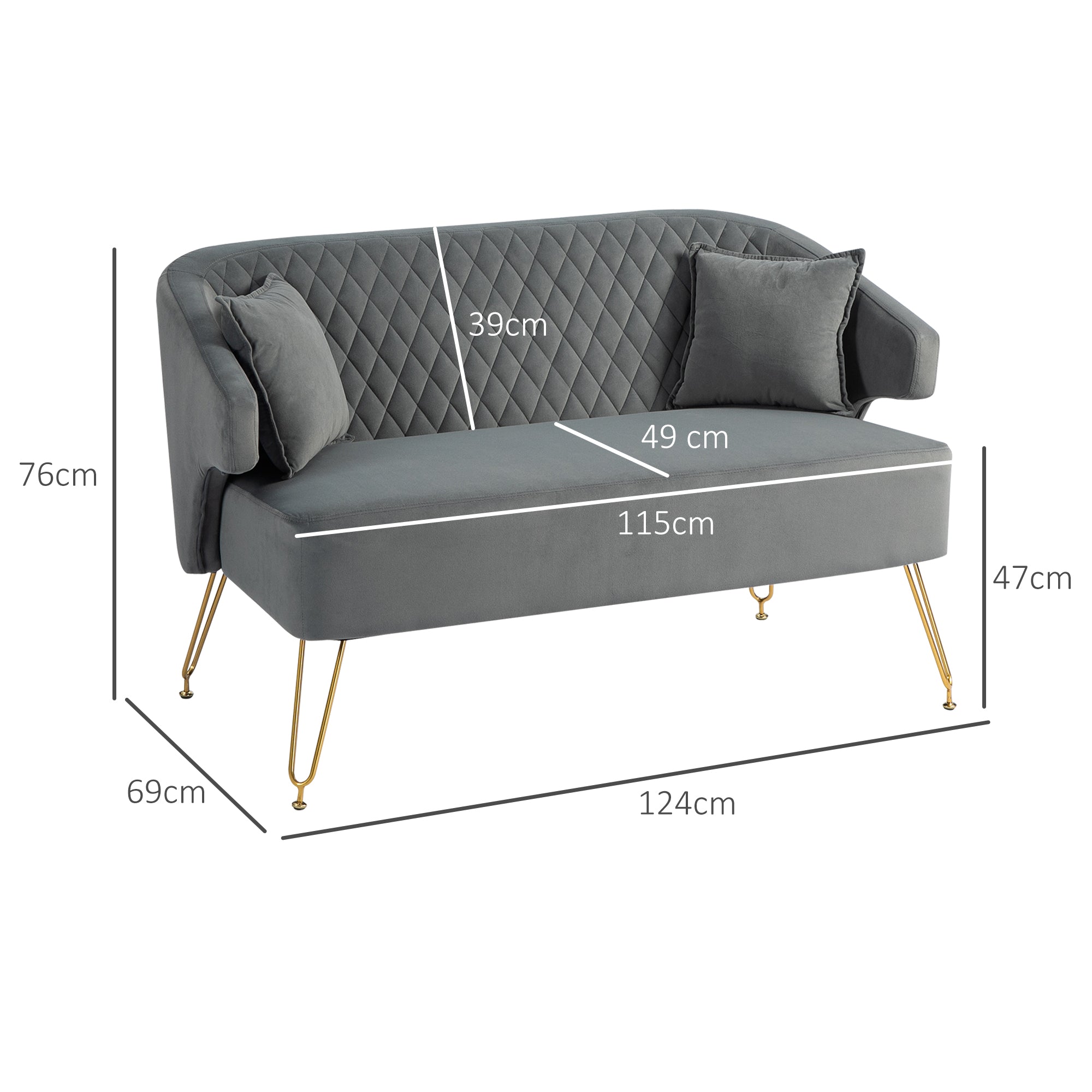 - MEDIDAS TOTAIS: 124x69x76 cm (CxLxA). Medidas do assento: 115x49x47 cm (CxLxA). Peso máximo suportado: 240 kg. Montagem simples Descubra o encanto deste sofá de dois lugares da HOMCOM, onde o conforto encontra o estilo. Este sofá apresenta um distinto padrão acolchoado estilo diamantes em tecido cinzento, complementado por elegantes pernas douradas em forma de gancho. Desfrute do conforto do seu assento almofadado de 21 cm e de 2 almofadas adicionais, ideais para proporcionar conforto e elegância a qualquer canto