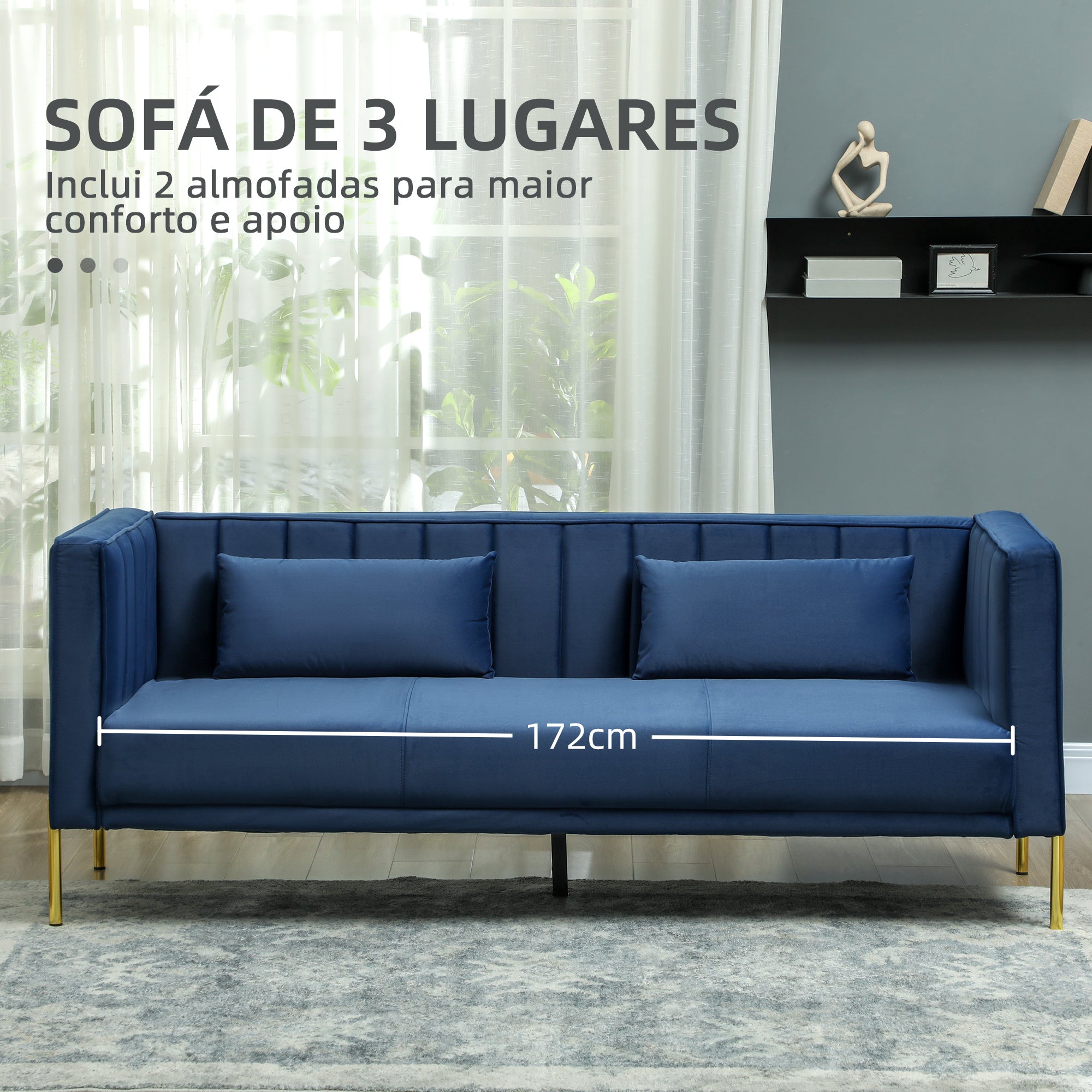 Sofá de 3 Lugares Sofá Sala de Estar de 194,5 cm Estofado em Veludo com 2 Almofadas Apoio para os Braços e Pés Dourados Azul Marinho