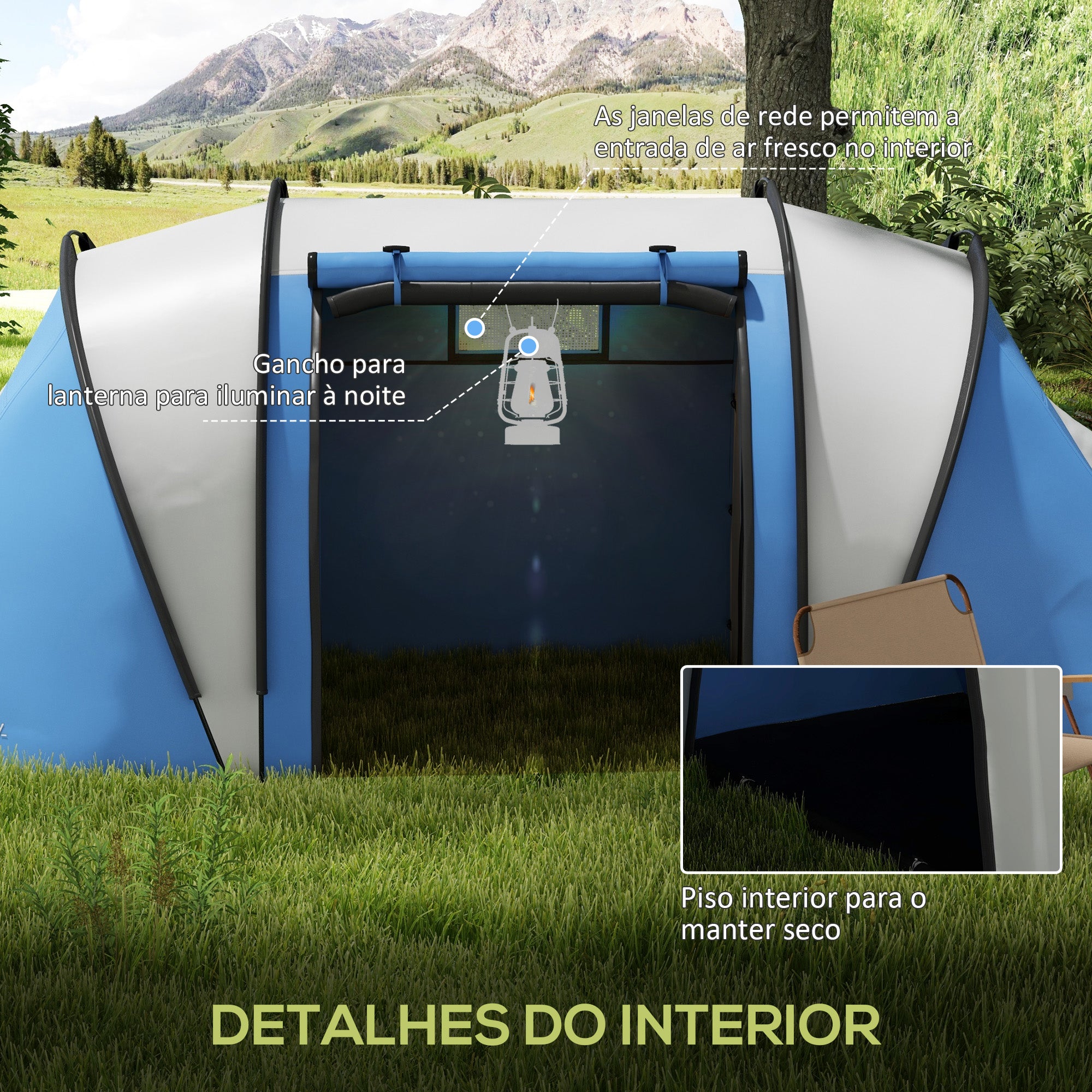 Tenda de Campismo Familiar para 4-5 Pessoas Tenda de Campismo Túnel Impermeável 3000 mm com 2 Quartos Bolsa de Transporte e Gancho Ideal para Caminhadas e Pesca Azul
