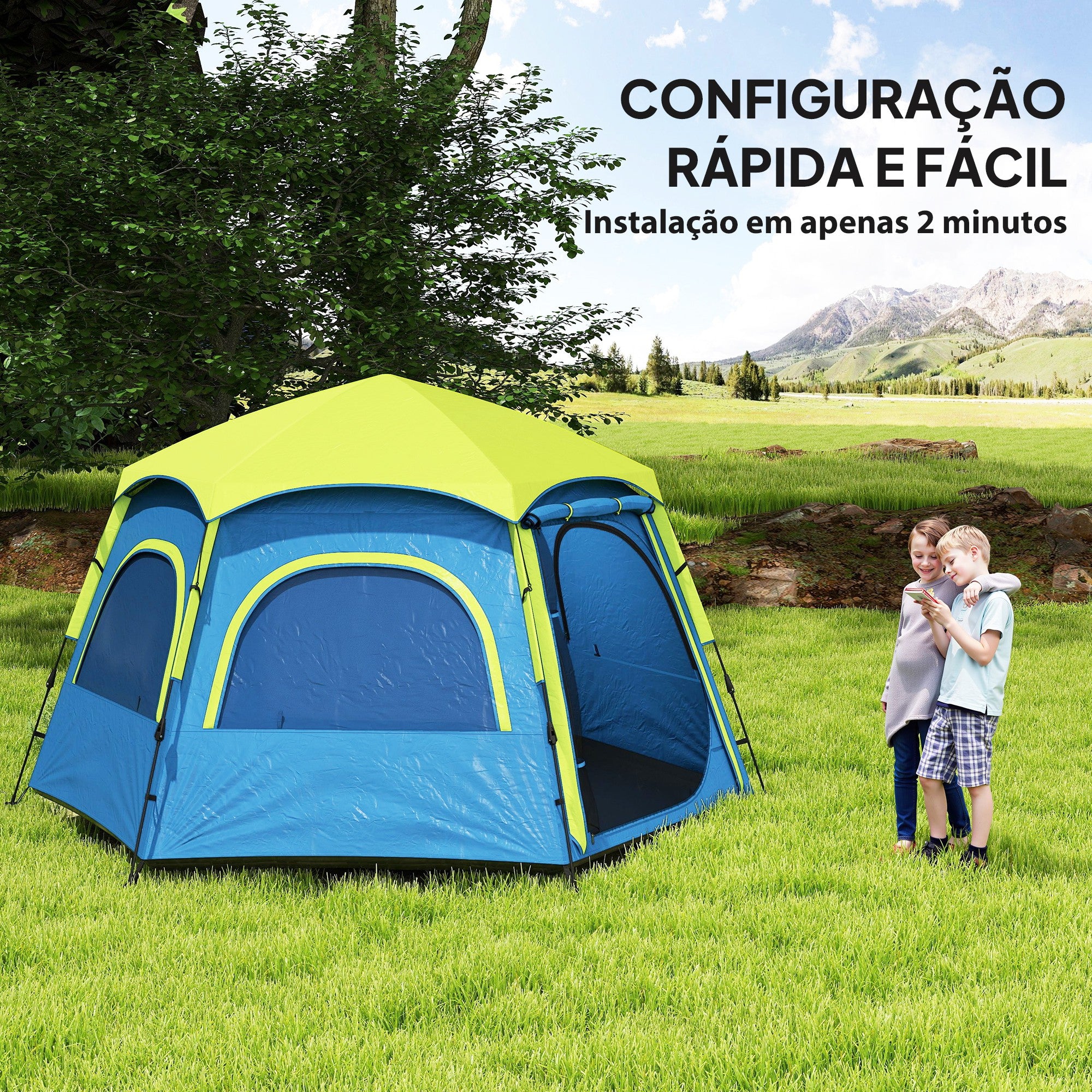 - Tenda para parque de campismo de fácil montagem, monta·se em apenas alguns minutos Acomoda até quatro pessoas sentadas ou três a dormir confortavelmente Tecido Oxford 210D com revestimento de prata melhora a proteção UV Inclui estacas para o solo e cordas de tensão para maior estabilidade Duas portas e quatro janelas de rede bidireccionais melhoram a ventilação Desnho hexagonal espaçoso otimiza o fluxo de ar para uma experiência confortável Leve, com 5 kg, vem com uma bolsa de transporte incluída