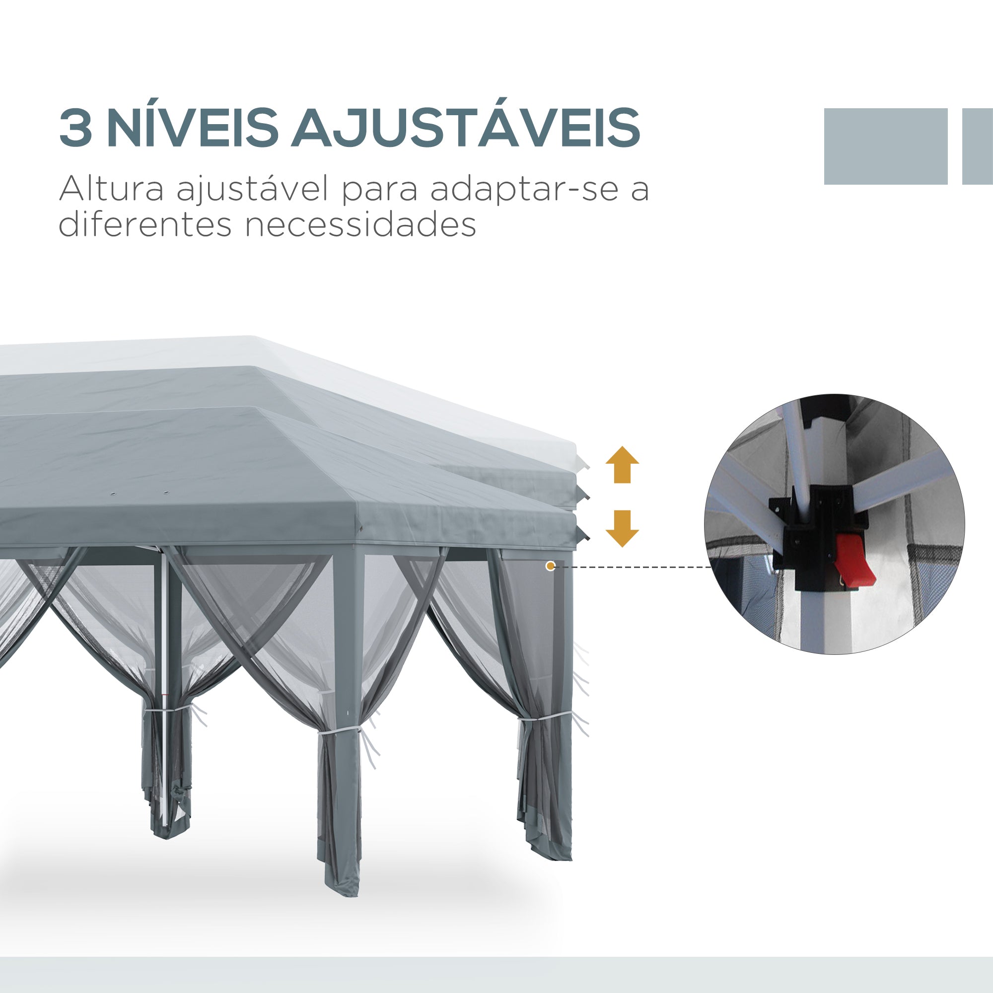 - Tenda de grandes dimensões para proteger do sol, proporcionando uma ampla área sombreada Estrutura dobrável de aço Q195 de alta qualidade Tenda com desenho pop·up de montagem e desmontagem fácil e rápida Leve e portátil para uso e transporte em qualquer evento Ideal para encontros familiares, piqueniques, acampamentos ou festas no pátio Toldo resistente à água e intempéries, com painéis laterais de malha anti·mosquitos Possui 12 orifícios de drenagem para evitar acúmulo de água em dias chuvosos Nota: Para proteger a tenda e prolongar sua vida útil, não deve ser usada em dias de chuva, vento ou outras condições climáticas adversas