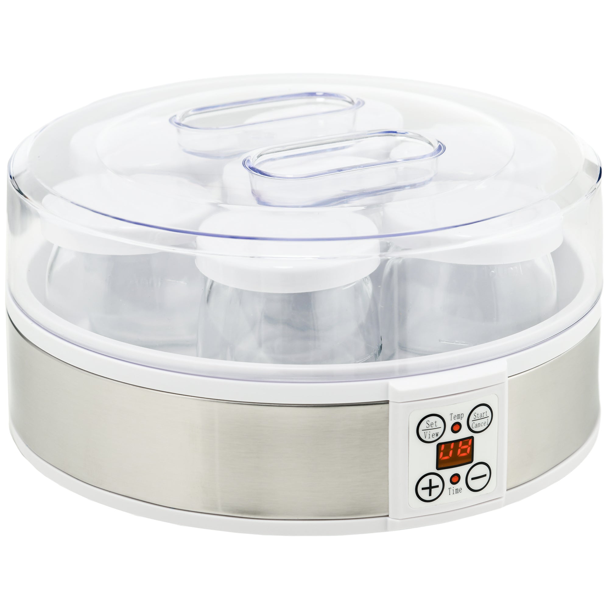 - MATERIAL SEGURO: Nossa máquina de iogurte possui recipientes sem BPA e uma estrutura de aço inoxidável durável e resistente à ferrugem. A tampa transparente permite monitorar o processo de fermentação sem levantar a tampa. MEDIDAS TOTAIS: Ø24x13 cm (DxA) Gosta de fazer iogurte em casa? Escolha a iogurteira da HOMCOM e não se arrependerá. Sua estrutura única garante transmissão uniforme de calor e manutenção da ativação de Lactobacillus. Poderá desfrutar de um iogurte saboroso e saudável em qualquer lugar. Os 7 potes de vidro permitem fazer 7 sabores diferentes ao mesmo tempo. Você pode adicionar as frutas, suco e mel que desejar