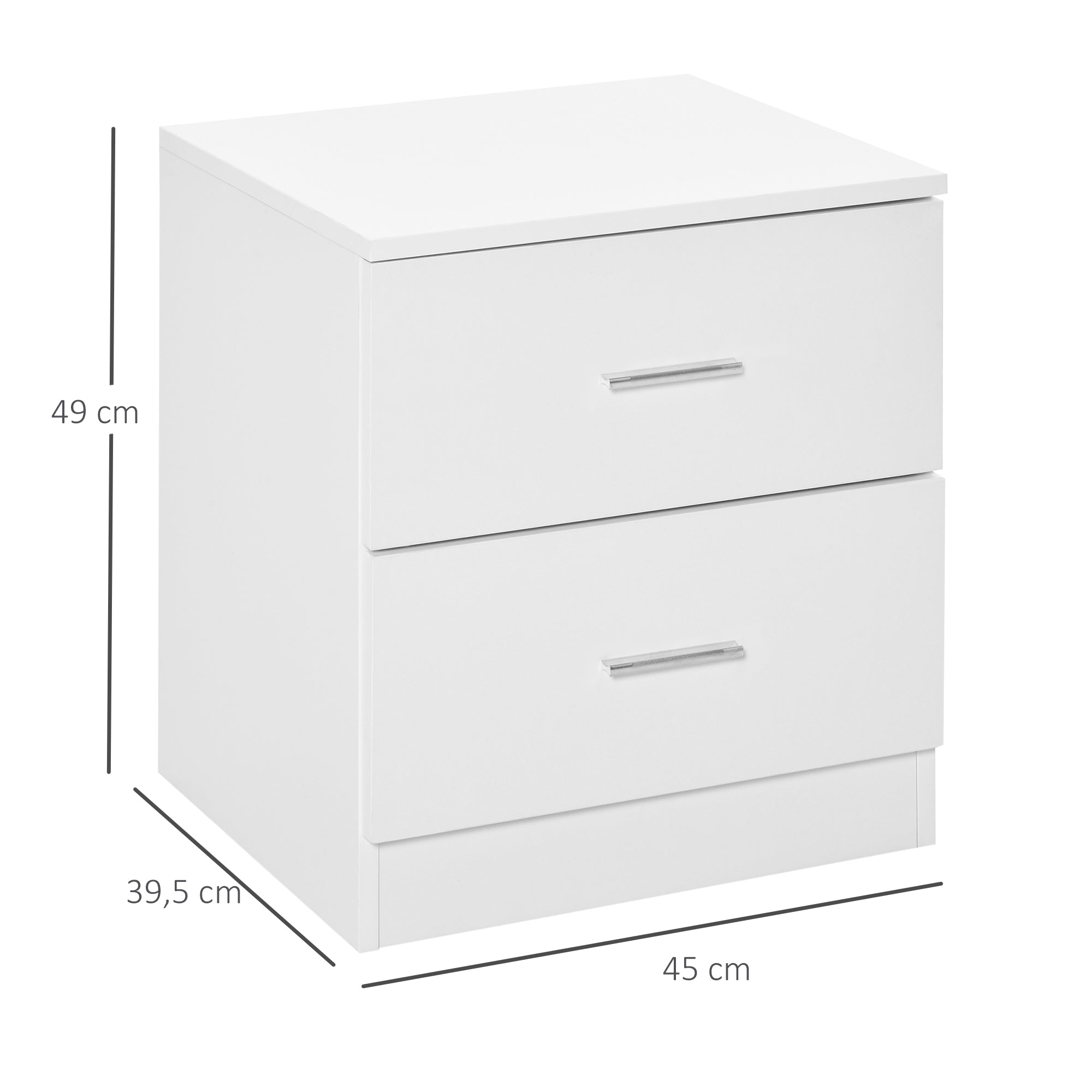 - MEDIDAS TOTAIS: 45x39,5x49 cm (CxLxA). Peso máximo suportado: 30 kg (no total), 5 kg (cada gaveta) À procura de uma mesinha de cabeceira para o seu quarto de hóspedes ou para a sua cama individual? Esta mesinha de cabeceira da HOMCOM, em madeira branca, com 2 gavetas, é uma excelente opção. Possui 2 gavetas para que possa guardar os seus itens essenciais antes de dormir. Mas não só isso, o seu desenho moderno e simples também permite que a utilize como cómoda ao lado da sua secretária ou como mesa auxiliar em qualquer parte da sua casa ou escritório