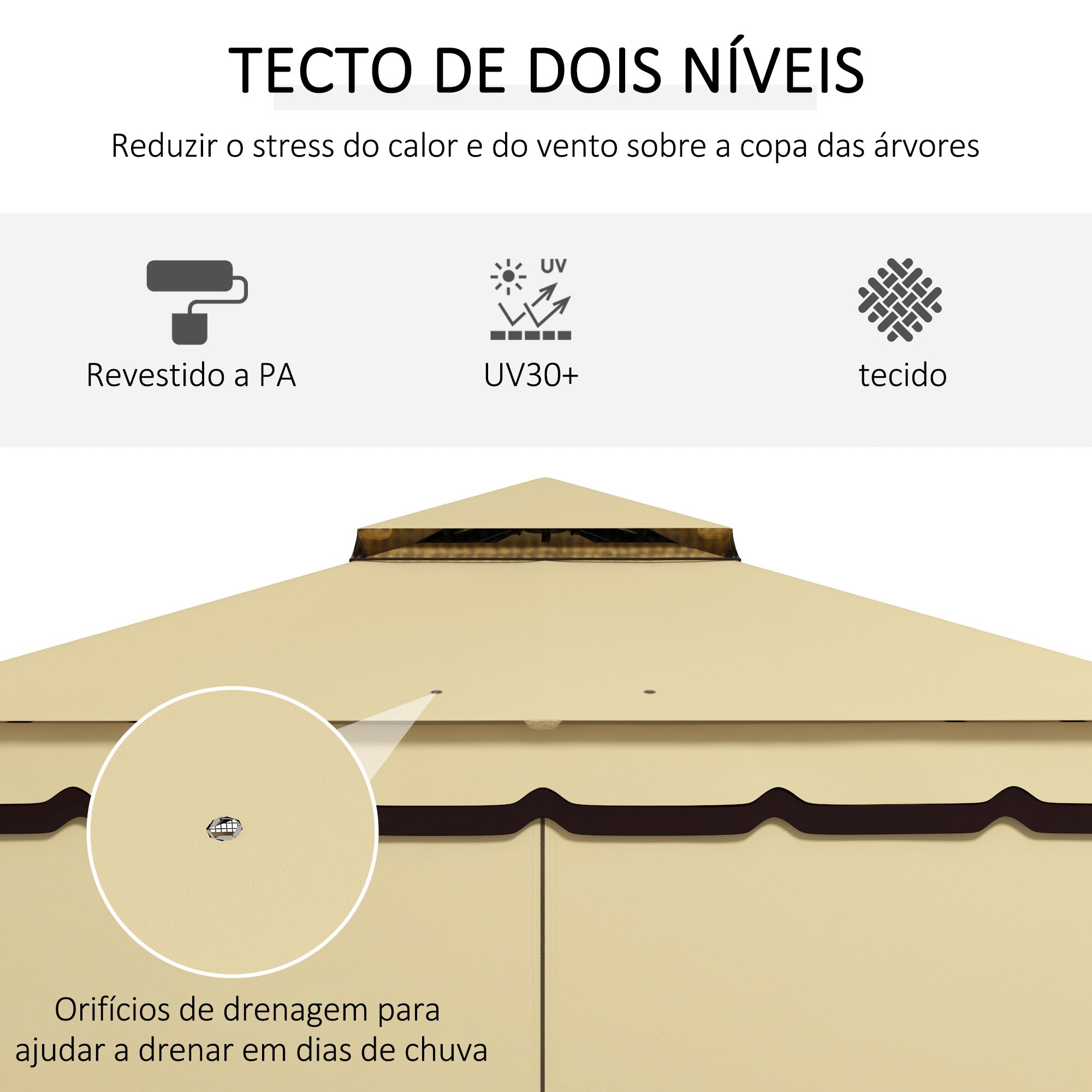 • PÉRGOLA DE JARDIM COM TETO DUPLO: Esta pérgola de jardim possui um teto de dupla camada com revestimento em PA que proporciona proteção UV30+. Este desenho permite uma melhor circulação do ar sem sacrificar a proteção e ajuda a manter a pérgola fresca mesmo em dias quentes. Além disso, a malha nas grelhas do teto impede a entrada de insetos, permitindo que desfrute do ar livre sem preocupações