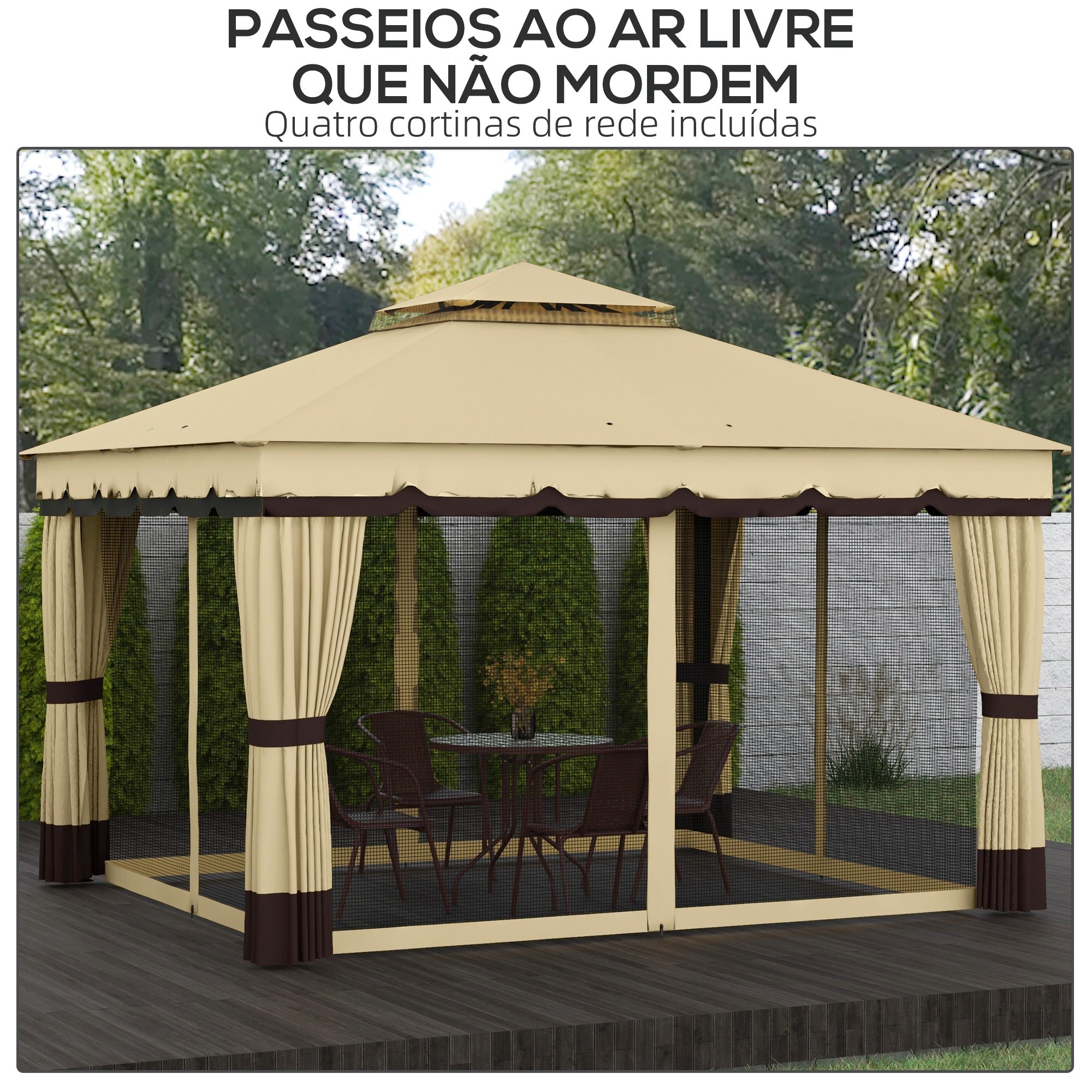 • COM CORTINAS E MOSQUITEIROS REMOVÍVEIS: Esta pérgola de pátio está equipada com cortinas que pode remover quando desejar. Estas protegem do sol e eliminam o encandeamento de todos os ângulos, transformando a pérgola num espaço privado quando desejar. Além disso, os mosquiteiros incorporados protegem a sua área de descanso contra insetos indesejados