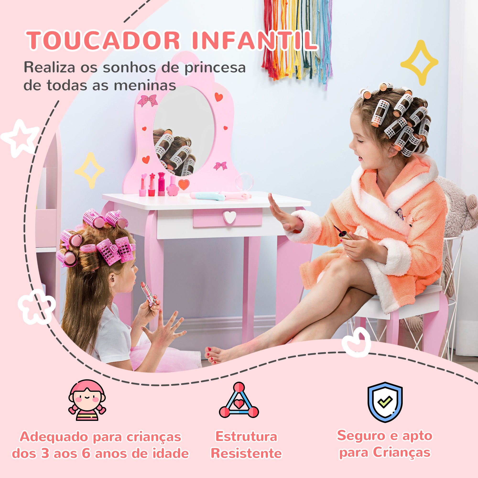 - TOUCADOR INFANTIL ELEGANTE: Bonito conjunto de toucador infantil com espelho com desenhos de coração e em forma de arco e banco para que os pequenos de casa se divirtam e realizem o sonho de princesa, enquanto se penteiam, maquilham, etc. É uma perfeita adição para quartos infantis, brinquedoteca ou escolas infantis
