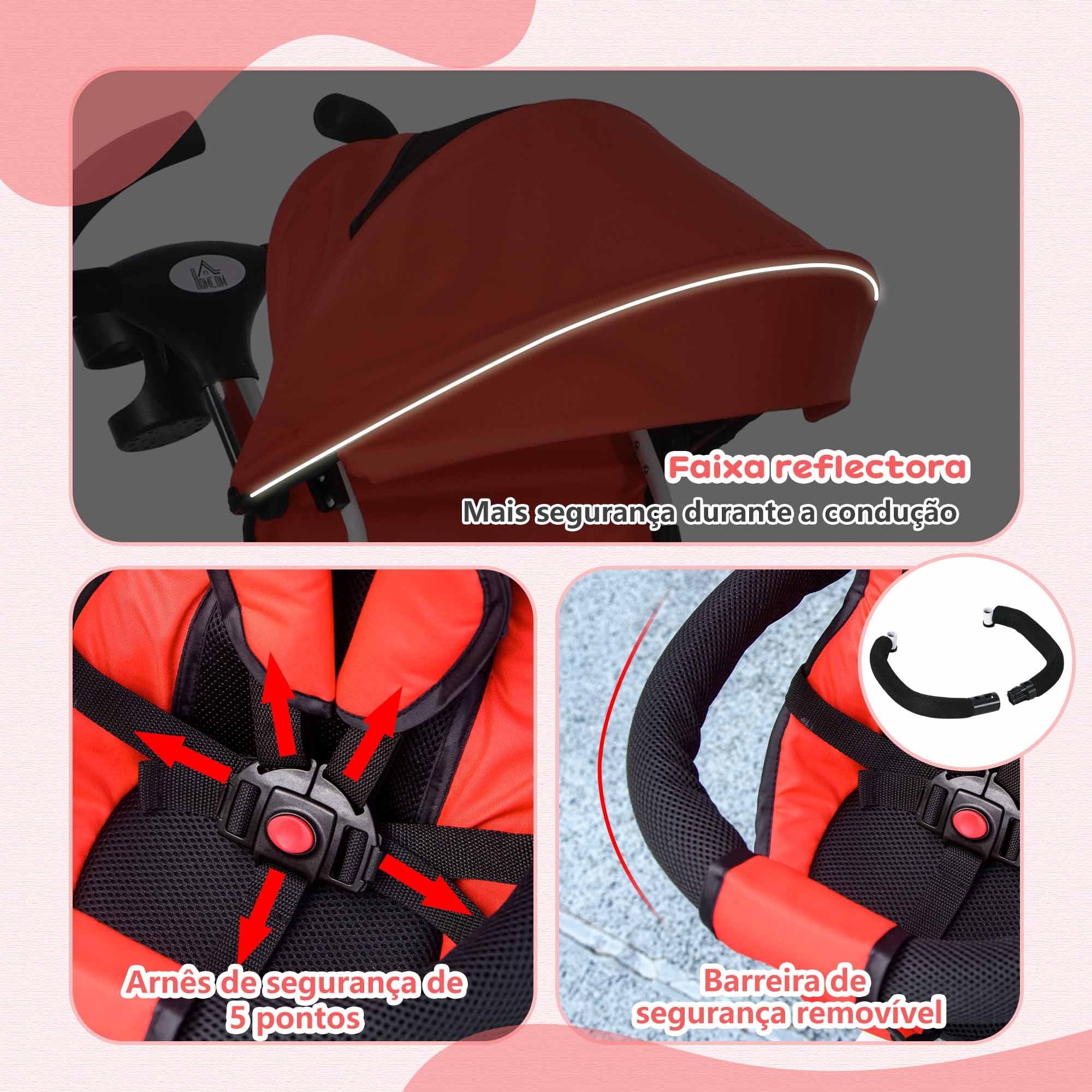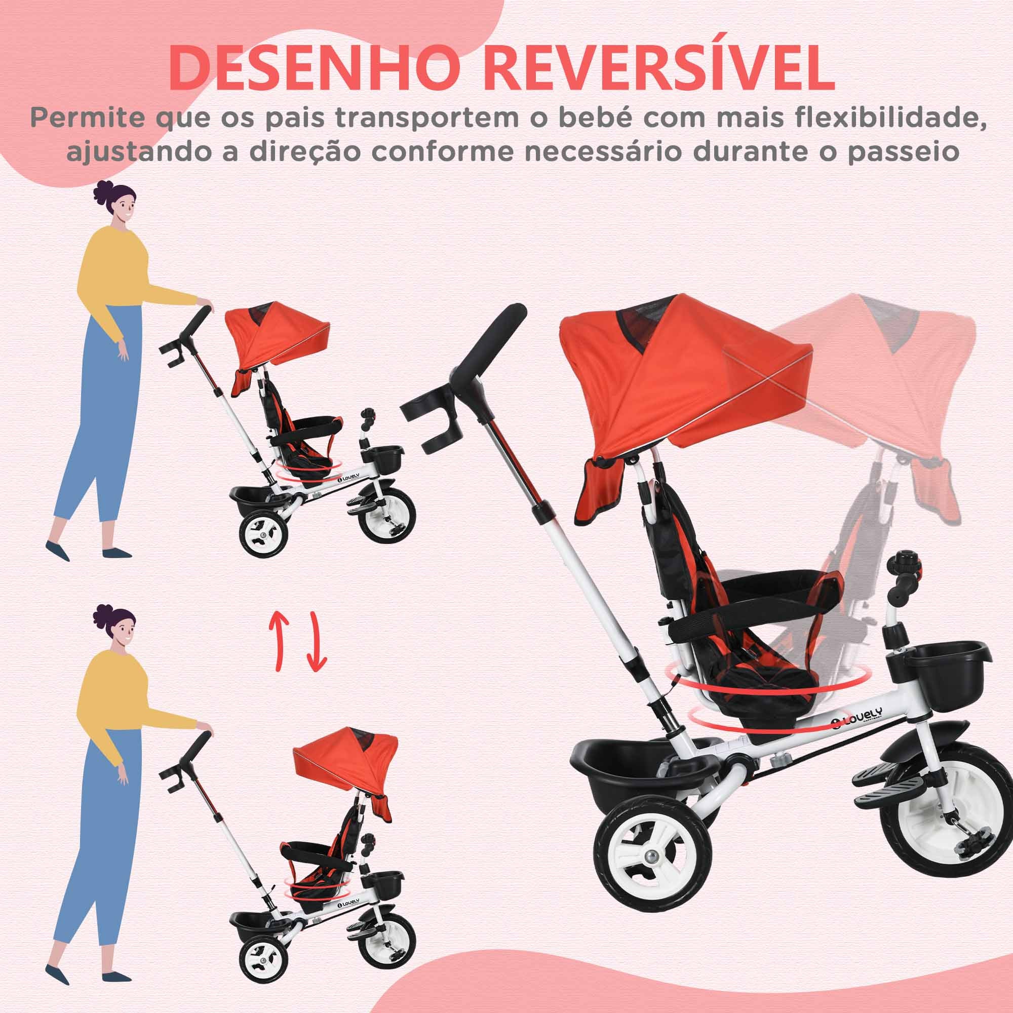 Triciclo para Bebés Dobrável Triciclo Evolutivo 2 em 1 para Crianças de 12-60 Meses com Capota Dobrável Guiador Telescópico Apoio para os Pés Cinto de Segurança e Cesto 112x50x104 cm Vermelho